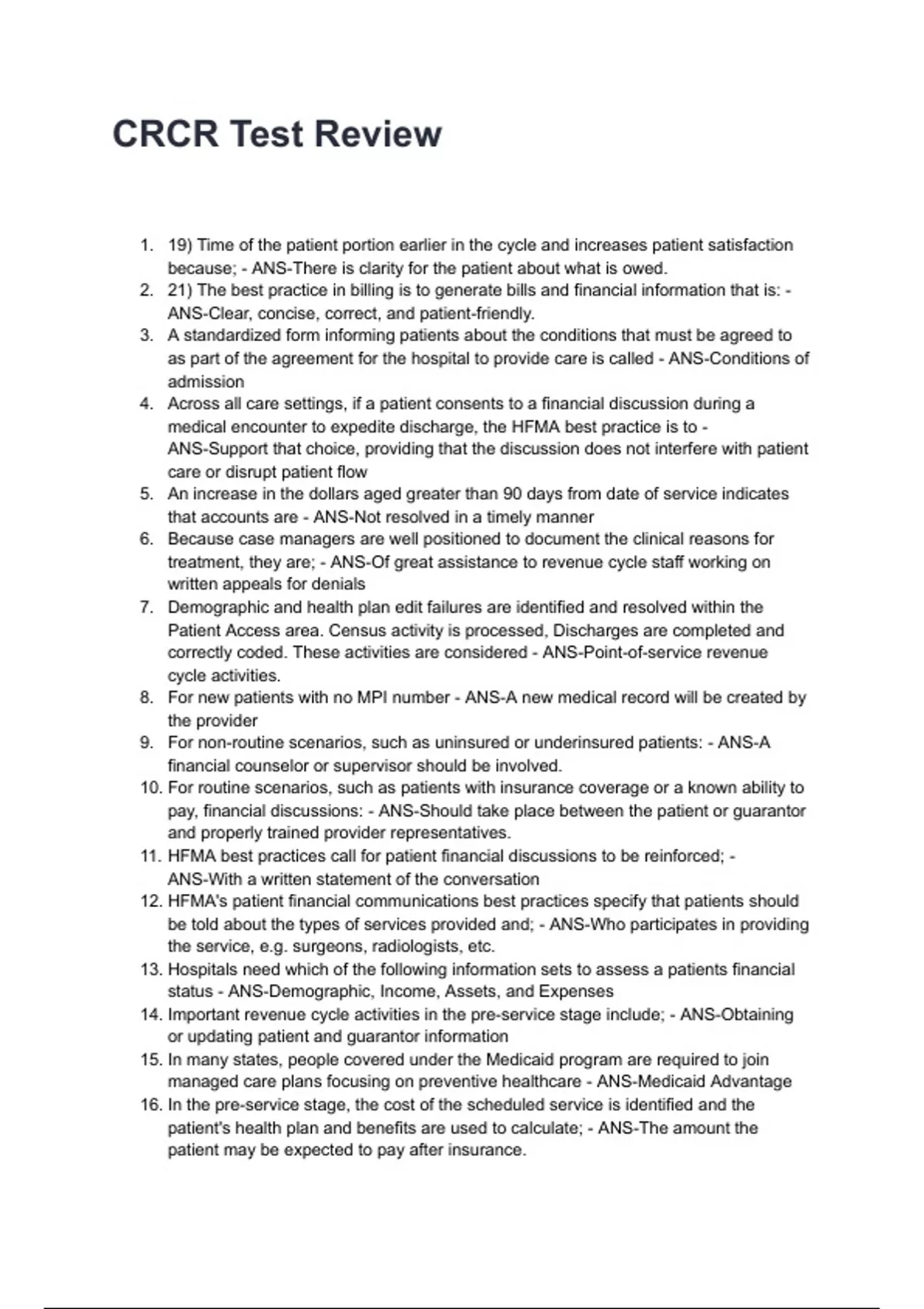 11. HFMA best practices call for patient financial discussions to be reinforced; -