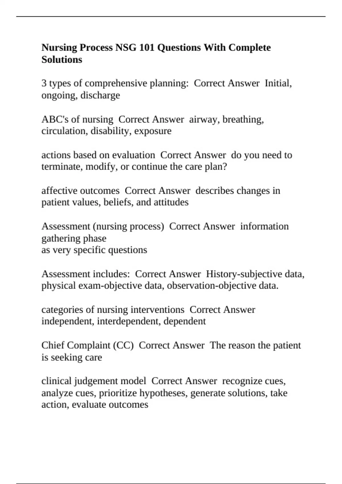 Nursing Process NSG 101 Questions With Complete Solutions.