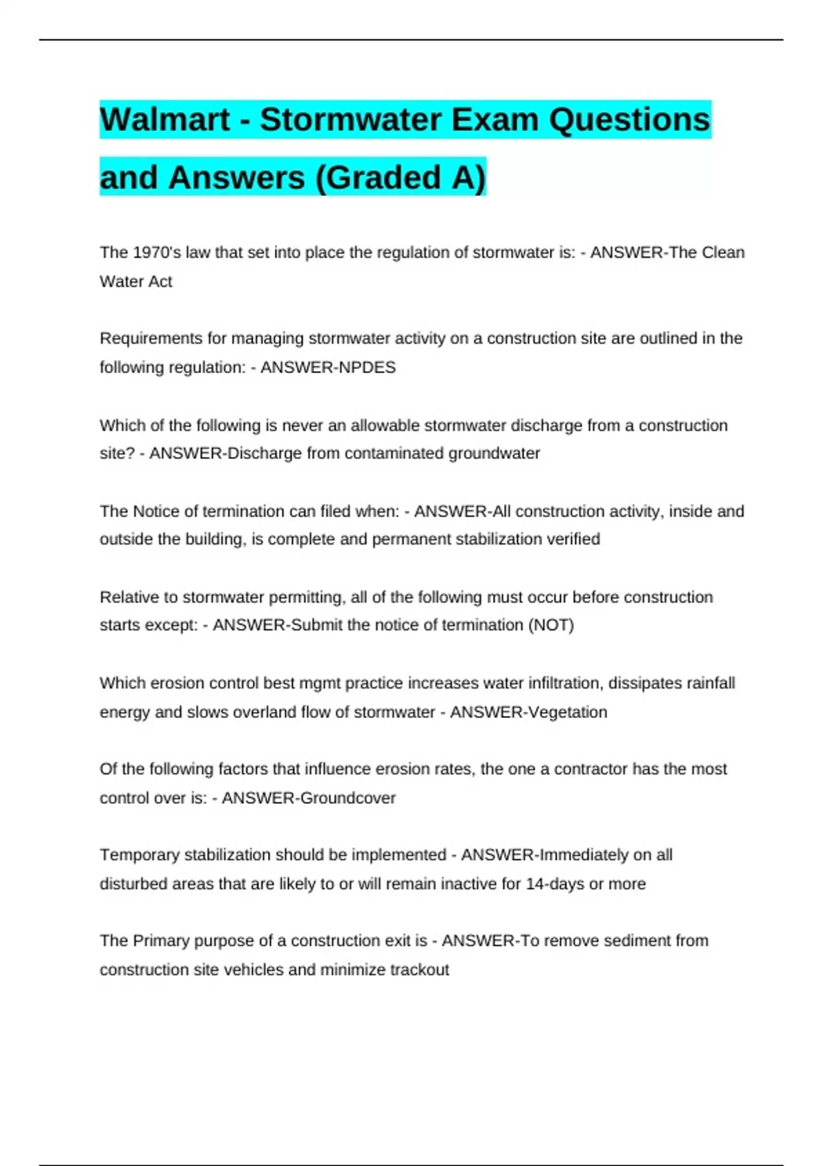 Walmart - Stormwater Exam Questions and Answers (Graded A)Walmart - Stormwater Exam Questions and Answers (Graded A)Walmart - Stormwater Exam Questions and Answers (Graded A)Walmart - Stormwater Exam Questions and Answers (Graded A) The 1970's law that set into place the regulation of stormwater is: - ANSWER-The Clean Water Act Requirements for managing stormwater activity on a construction site are outlined in the following regulation: - ANSWER-NPDES Which of the following is never an allowable stormwater discharge from a construction site? - ANSWER-Discharge from contaminated groundwater