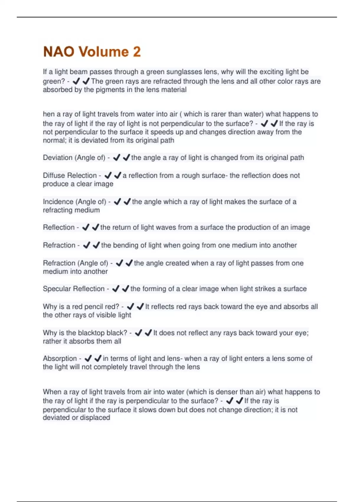 If a light beam passes through a green sunglasses lens, why will the exciting light be green? - ️️The green rays are refracted through the lens and all other color rays are absorbed by the pigments in the lens material hen a ray of light travels from water into air ( which is rarer than water) what happens to the ray of light if the ray of light is not perpendicular to the surface? - ️️If the ray is not perpendicular to the surface it speeds up and changes direction away from the normal; it is deviated from its original path Deviation (Angle of) - ️️the angle a ray of light is changed from its original path Diffuse Relection - ️️a reflection from a rough surface- the reflection does not produce a clear image Incidence (Angle of) - ️️the angle which a ray of light makes the surface of a refracting medium Reflection - ️️the return of light waves from a surface the production of an image Refraction - ️️the bending of light when going from one medium into another Refraction (Angle of) - ️️the angle created when a ray of light passes from one medium into another Specular Reflection - ️️the forming of a clear image when light strikes a surface Why is a red pencil red? - ️️It reflects red rays back toward the eye and absorbs all the other rays of visible light Why is the blacktop black? - ️️It does not reflect any rays back toward your eye; rather it absorbs them all Absorption - ️️in terms of light and lens- when a ray of light enters a lens some of the light will not completely travel through the lens When a ray of light travels from air into water (which is denser than air) what happens to the ray of light if the ray is perpendicular to the surface? - ️️If the ray is perpendicular to the surface it slows down but does not change direction; it is not deviated or displacedWhen a ray of light travels from air into water (which is denser than air) what happens to the ray of light if the ray is not perpendicular to the surface? - ️️If the ray is not perpendicular to the surface it slows down and changes direction toward the normal; it is deviated from its original path When a ray of light travels from water into air ( which is rarer than water) what happens to the ray of light if the ray is perpendicular to the surface? - ️️If the ray is perpendicular to the surface it speeds up but does not change direction; it is not deviated or displaced