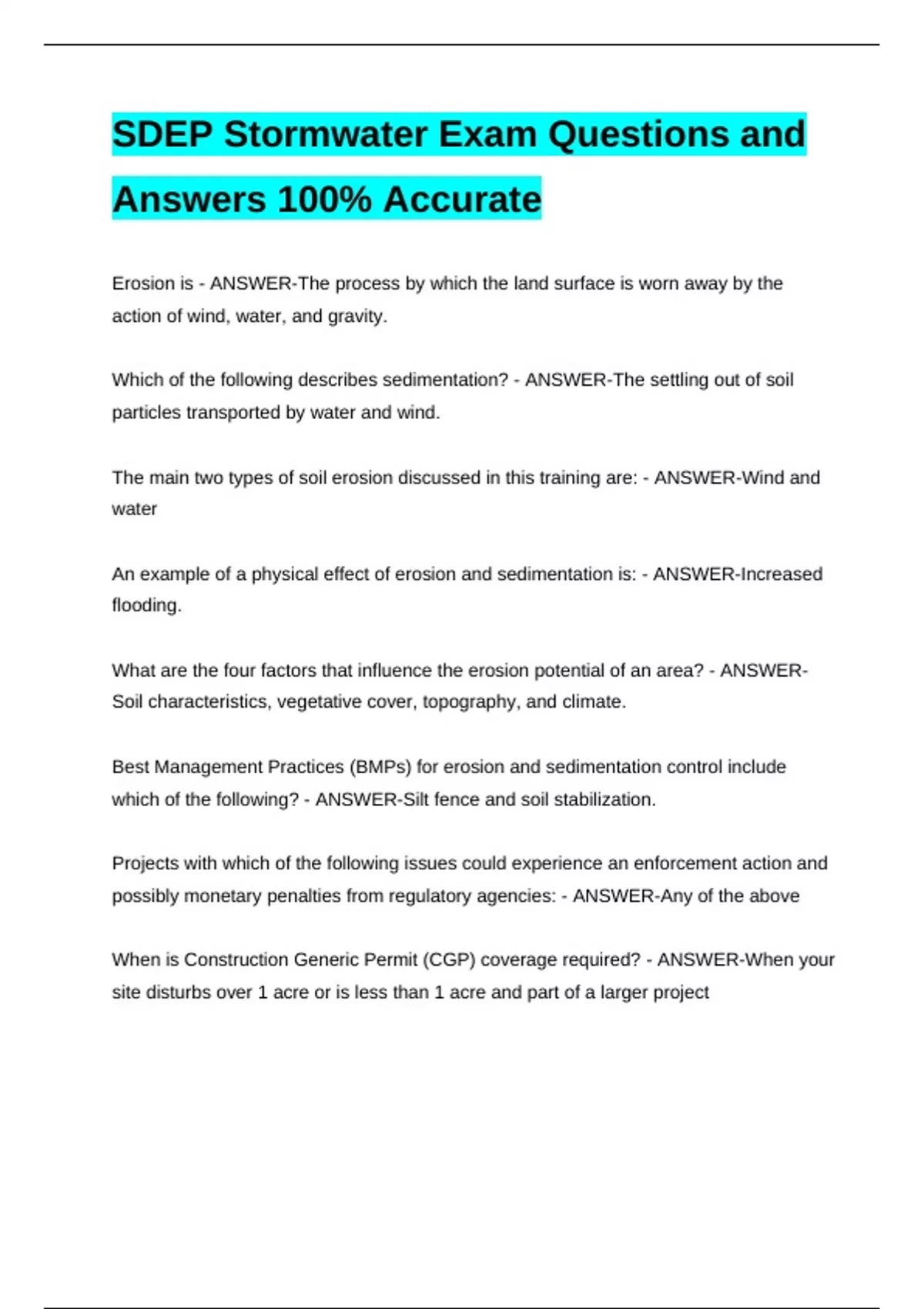 SDEP Stormwater Exam Questions and Answers 100% AccurateSDEP Stormwater Exam Questions and Answers 100% AccurateSDEP Stormwater Exam Questions and Answers 100% AccurateSDEP Stormwater Exam Questions and Answers 100% AccurateSDEP Stormwater Exam Questions and Answers 100% Accurate Erosion is - ANSWER-The process by which the land surface is worn away by the action of wind, water, and gravity. Which of the following describes sedimentation? - ANSWER-The settling out of soil particles transported by water and wind. The main two types of soil erosion discussed in this training are: - ANSWER-Wind and water An example of a physical effect of erosion and sedimentation is: - ANSWER-Increased flooding.