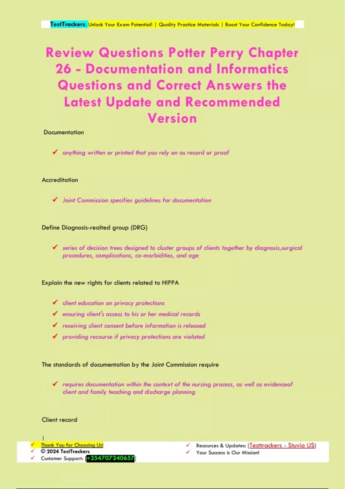 Documentation anything written or printed that you rely on as record or proof Accreditation Joint Commission specifies guidelines for documentation Define Diagnosis-realted group (DRG) series of decision trees designed to cluster groups of clients together by diagnosis,surgical procedures, complications, co-morbidities, and age Explain the new rights for clients related to HIPPA client education on privacy protections ensuring client's access to his or her medical records receiving client consent before information is released providing recourse if privacy protections are violated The standards of documentation by the Joint Commission require requires documentation within the context of the nursing process, as well as evidenceof client and family teaching and discharge planning Client record TestTrackers: Unlock Your Exam Potential! | Quality Practice Materials | Boost Your Confidence Today! | Thank You for Choosing Us! © 2024 TestTrackers Customer Support: [] Resources & Updates: [Testtrackers - Stuvia US] Your Success is Our Mission! is a confidential, permanent legal documentation of information relevant to a client'shealth care Reports oral, written, or audiotaped exchanges between caregivers Consultations form of discussion whereby one professional caregiver gives formal advice about the level of care of a client to another caregiver Referrals an arrangement for services by another care provider Communication means by which client needs and progress, individual therapies, client education, and discharge planning are conveyed to others in the health care team Legal Documentation Once of the best defenses for legal claims Financial Billing To determine the accurate and timely reimbursement Education Learning the nature of an illness and the individual client's responses TestTrackers: Unlock Your Exam Potential! | Quality Practice Materials | Boost Your Confidence Today! | Thank You for Choosing Us! © 2024 TestTrackers Customer Support: [] Resources & Updates: [Testtrackers - Stuvia US] Your Success is Our Mission! Research Gathering of statistical data of clinical disorders, complications, therapies, recovery and deaths Auditing Objective, ongoing reviews to determine the degree to which quality improvement standards are met. What are the five guidelines for quality documentation and reporting Factual Accurate Complete Current Organized Factual descriptive, objective information about what a nurse sees, hears, feels, and smells Accurate the use of accepted abbreviations, symbols, and system of measures that are clear andeasy to understand Complete containing appropriate and essential information Current TestTrackers: Unlock Your Exam Potential! | Quality Practice Materials | Boost Your Confidence Today! | Thank You for Choosing Us! © 2024 TestTrackers Customer Support: [] Resources & Updates: [Testtrackers - Stuvia US] Your Success is Our Mission! timely entries; immediate documentation of information as it is collected from theclient Organize