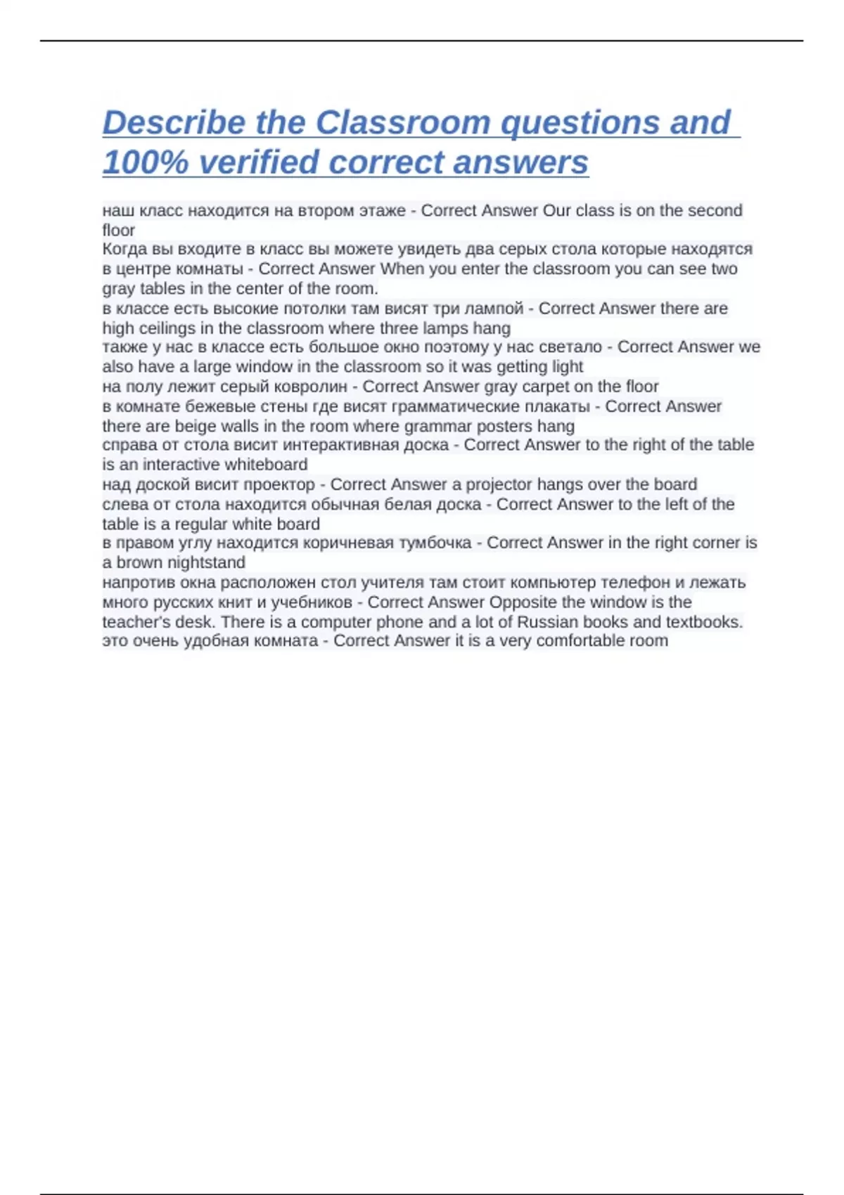 Describe the Classroom questions and 100% verified correct answers наш класс находится на втором этаже - Correct Answer Our class is on the second floor Когда вы входите в класс вы можете увидеть два серых стола которые находятся в центре комнаты - Correct Answer When you enter the classroom you can see two gray tables in the center of the room. в классе есть высокие потолки там висят три лампой - Correct Answer there are high ceilings in the classroom where three lamps hang также у нас в классе есть большое окно поэтому у нас светало - Correct Answer we also have a large window in the classroom so it was getting light на полу лежит серый ковролин - Correct Answer gray carpet on the floor в комнате бежевые стены где висят грамматические плакаты - Correct Answer there are beige walls in the room where grammar posters hang справа от стола висит интерактивная доска - Correct Answer to the right of the table is an interactive whiteboard над доской висит проектор - Correct Answer a projector hangs over the board слева от стола находится обычная белая доска - Correct Answer to the left of the table is a regular white board в правом углу находится коричневая тумбочка - Correct Answer in the right corner is a brown nightstand напротив окна расположен стол учителя там стоит компьютер телефон и лежать много русских книт и учебников - Correct Answer Opposite the window is the teacher's desk. There is a computer phone and a lot of Russian books and textbooks. это очень удобная комната - Correct Answer it is a very