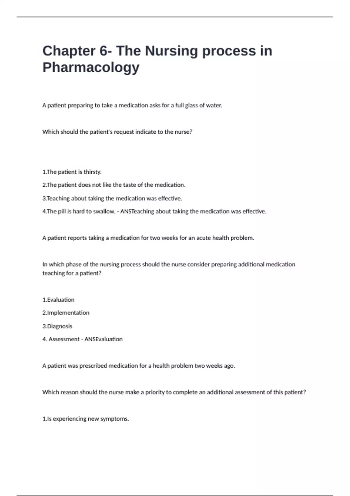 Chapter 6- The Nursing process in Pharmacology Exam Questions and Answers Latest Edition.
