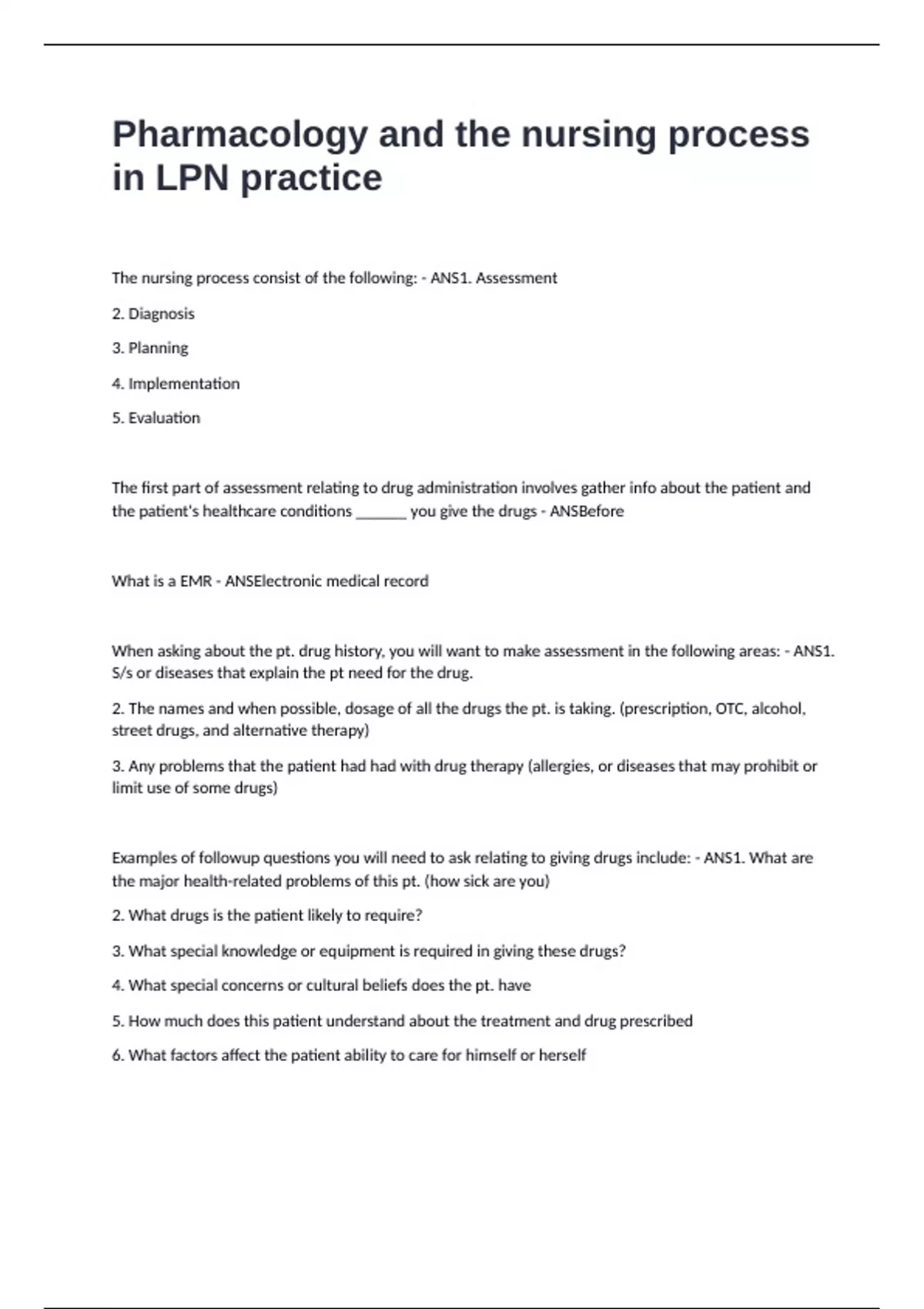Pharmacology and the nursing process in LPN practice Questions and Answers End of Year Edition