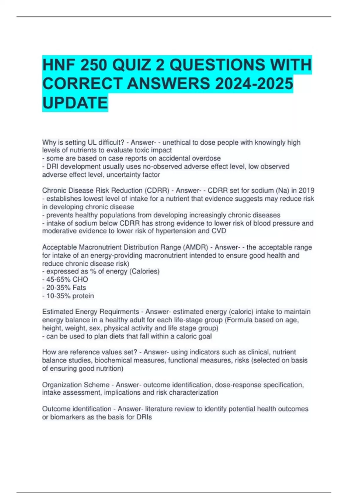 HNF 250 QUIZ 2 QUESTIONS WITH CORRECT ANSWERS UPDATE Why is setting UL difficult? - Answer- - unethical to dose people with knowingly high levels of nutrients to evaluate toxic impact - some are based on case reports on accidental overdose - DRI development usually uses no-observed adverse effect level, low observed adverse effect level, uncertainty factor Chronic Disease Risk Reduction (CDRR) - Answer- - CDRR set for sodium (Na) in 2019 - establishes lowest level of intake for a nutrient that evidence suggests may reduce risk in developing chronic disease - prevents healthy populations from developing increasingly chronic diseases - intake of sodium below CDRR has strong evidence to lower risk of blood pressure and moderative evidence to lower risk of hypertension and CVD Acceptable Macronutrient Distribution Range (AMDR) - Answer- - the acceptable range for intake of an energy-providing macronutrient intended to ensure good health and reduce chronic disease risk) - expressed as % of energy (Calories) - 45-65% CHO - 20-35% Fats - 10-35% protein Estimated Energy Requirments - Answer- estimated energy (caloric) intake to maintain energy balance in a healthy adult for each life-stage group (Formula based on age, height, weight, sex, physical activity and life stage group) - can be used to plan diets that fall within a caloric goal How are reference values set? - Answer- using indicators such as clinical, nutrient balance studies, biochemical measures, functional measures, risks (selected on basis of ensuring good nutrition) Organization Scheme - Answer- outcome identification, dose-response specification, intake assessment, implications and risk characterization