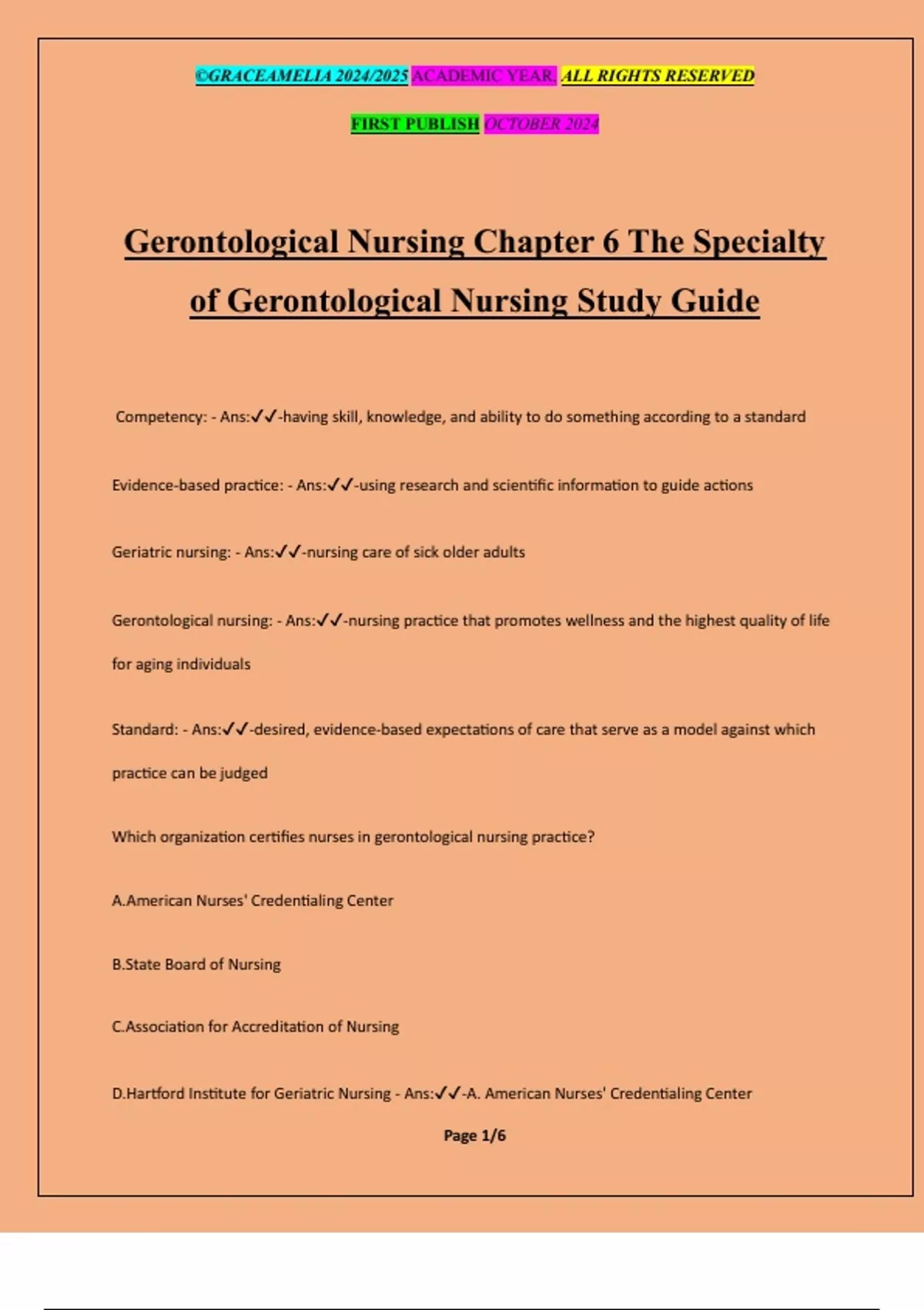 Gerontological Nursing Chapter 6 The Specialty of Gerontological Nursing Study Guide Competency: - Ans:-having skill, knowledge, and ability to do something according to a standard Evidence-based practice: - Ans:-using research and scientific information to guide actions Geriatric nursing: - Ans:-nursing care of sick older adults Gerontological nursing: - Ans:-nursing practice that promotes wellness and the highest quality of life for aging individuals Standard: - Ans:-desired, evidence-based expectations of care that serve as a model against which practice can be judged Which organization certifies nurses in gerontological nursing practice? A.American Nurses' Credentialing Center B.State Board of Nursing C.Association for Accreditation of Nursing D.Hartford Institute for Geriatric Nursing - Ans:-A. American Nurses' Credentialing Center ©GRACEAMELIA 2024/2025 ACADEMIC YEAR. ALL RIGHTS RESERVED FIRST PUBLISH OCTOBER 2024 Page 2/6 True or False State and federal regulations outline minimum standards of practice for various health care workers and agencies. - Ans:-•True •Rationale: Professional nursing practice is guided by standards that reflect the level and expectations of care that are desired and serve as a model against which practice can be judged. What are the 10 ANA Standards of practice for Gerontological Nursing? - Ans:-1. Assessment 2. Diagnosis 3. Outcome Identification 4. Planning 5. Implementation 5A. Coordination of Care 5B. Health Teaching and Health Promotion 5C. Consultation 5D. Prescriptive Authority and Treatment 6. Evaluation ©GRACEAMELIA 2024/2025 ACADEMIC YEAR. ALL RIGHTS RESERVED FIRST PUBLISH OCTOBER 2024 Page 3/6 Tell me about the ANA standard 1: Assesment. - Ans:-The gerontological nurse collects comprehensive date pertinent to the older adult's physical and mental health or situation. Tell me about the ANA standard 2: Diagnosis - Ans:-The gerontological nurse analyzes that assessment date to determine the diagnoses or issues Tell me about the ANA standard 3: Outcome Identification - Ans:-The gerontological nurse identifies expected outcomes for a plan individualized to the older adult or situation Tell me about the ANA standard 4: Planning - Ans:-The gerontological nurse develops a plan to attain expected outcomes. Tell me about the ANA standard 5: Implementation - Ans:-The gerontological nurse implements the identified plan. Tell me about the ANA standard 5A: Coordination of Care - Ans:-The gerontological nurse coodinates care delivery Tell me about the ANA standard 5B: Health Teaching and health promotion - Ans:-The gerontological registered nurse employs strategies to promote health and a safe environment.
