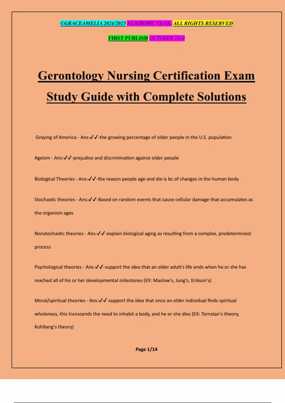 Moral/spiritual theories - Ans:✔✔-support the idea that once an older individual finds spiritual