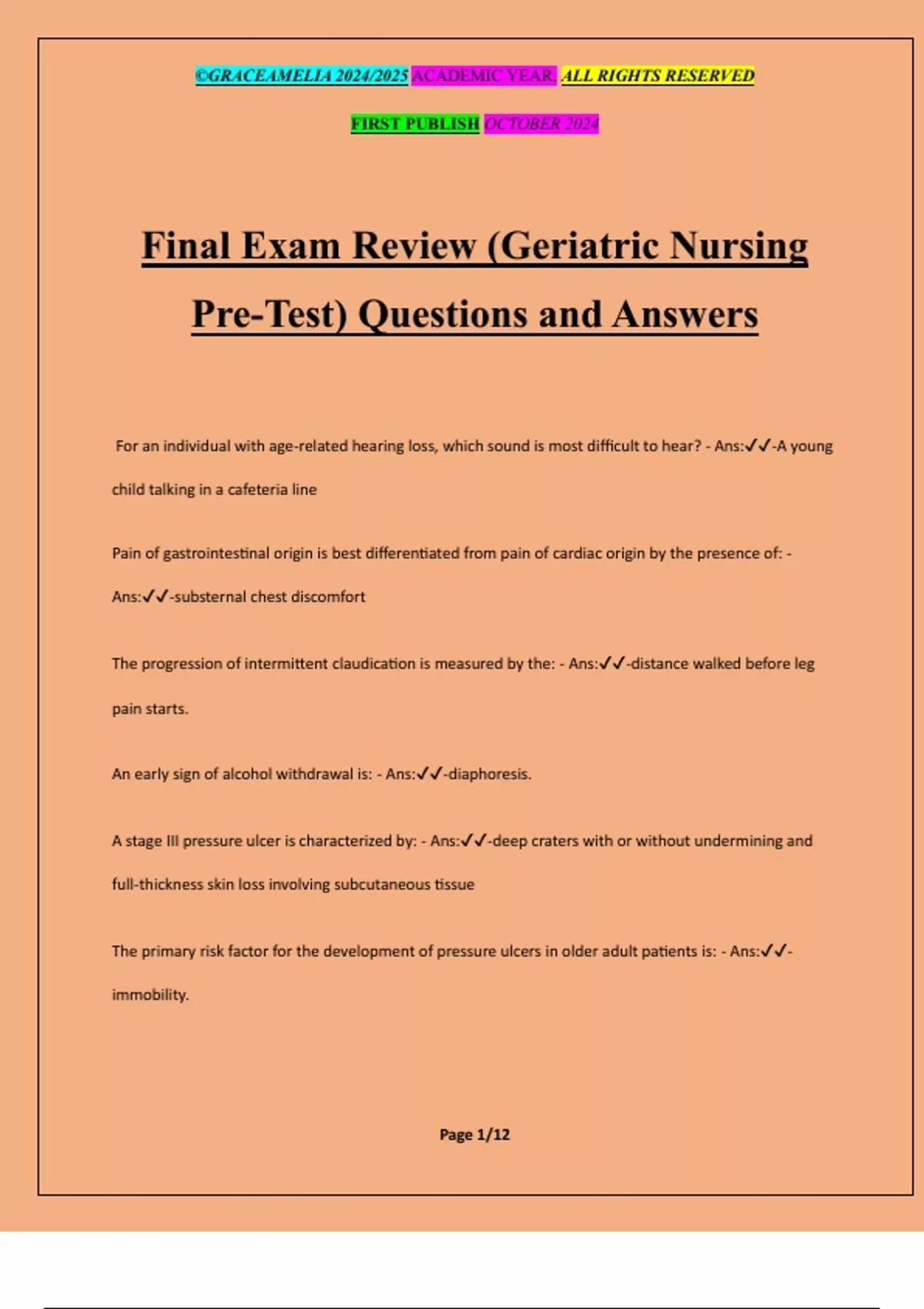 Final Exam Review (Geriatric Nursing Pre-Test) Questions and Answers For an individual with age-related hearing loss, which sound is most difficult to hear? - Ans:-A young child talking in a cafeteria line Pain of gastrointestinal origin is best differentiated from pain of cardiac origin by the presence of: - Ans:-substernal chest discomfort The progression of intermittent claudication is measured by the: - Ans:-distance walked before leg pain starts. An early sign of alcohol withdrawal is: - Ans:-diaphoresis. A stage III pressure ulcer is characterized by: - Ans:-deep craters with or without undermining and full-thickness skin loss involving subcutaneous tissue The primary risk factor for the development of pressure ulcers in older adult patients is: - Ans:- immobility. ©GRACEAMELIA 2024/2025 ACADEMIC YEAR. ALL RIGHTS RESERVED FIRST PUBLISH OCTOBER 2024 Page 2/12 An 80-year-old resident of a retirement center states that something is wrong with the lighting in the room because colored rings appear around the light bulbs. The resident most likely has: - Ans:- glaucoma. The most common cause of chronic pain in older adults is: - Ans:-arthritis. A 72-year-old man with asthma, chronic obstructive pulmonary disease, and chronic anxiety is admitted to a nursing home. Care plan objectives for this man include: - Ans:-adherence to his medication regimen, inhalation therapy, and instruction about methods of conserving energy. A 65-year-old man with a 45-year history of smoking complains of a change in his cough pattern, a nonproductive cough, and an ache in his chest. The man's chest x-ray reveals an infiltrate. The gerontological nurse suspects: - Ans:-a lung tumor. Which symptom in older adults is most indicative of a urinary tract infection? - Ans:-Confusion Which is a risk factor for vaginitis in older adult women? - Ans:-Prolonged antibiotic therapy Which condition might be indicated by an increase in hemoglobin values? - Ans:-Dehydration An 83-year-old female patient underwent a total hip replacement three days ago. She should not cross her legs because: - Ans:-adduction of the hip can cause dislocation of the prosthesis. A 76-year-old patient with osteoarthritis complains of pain, stiffness, and deformities of the fingers. The gerontological nurse recommends - Ans:-exercise ©GRACEAMELIA 2024/2025 ACADEMIC YEAR. ALL RIGHTS RESERVED FIRST PUBLISH OCTOBER 2024 Page 3/12 A factor that contributes to hypothermia in older adults is: - Ans:-decreased activity Heat stroke is a serious form of hyperthermia that is characterized by - Ans:-absence of sweating A gerontological nurse is teaching dressing techniques to a patient with right hemiplegia and a severe speech impairment. An appropriate first step in the nurse's teaching would be to: - Ans:-demonstrate the proper way to put on a shirt. Older adults with Parkinson disease exhibit: - Ans:-rigidity and tremor at rest. To prevent injury, a gerontological nurse advises an older adult who is taking tricyclic antidepressants to: - Ans:-stand up slowly from sitting or lying positions. Persons who are taking anticholinergic drugs are at high risk for: - Ans:-dry mouth. Age-related changes in which two organs most affect an older adult's reaction to m
