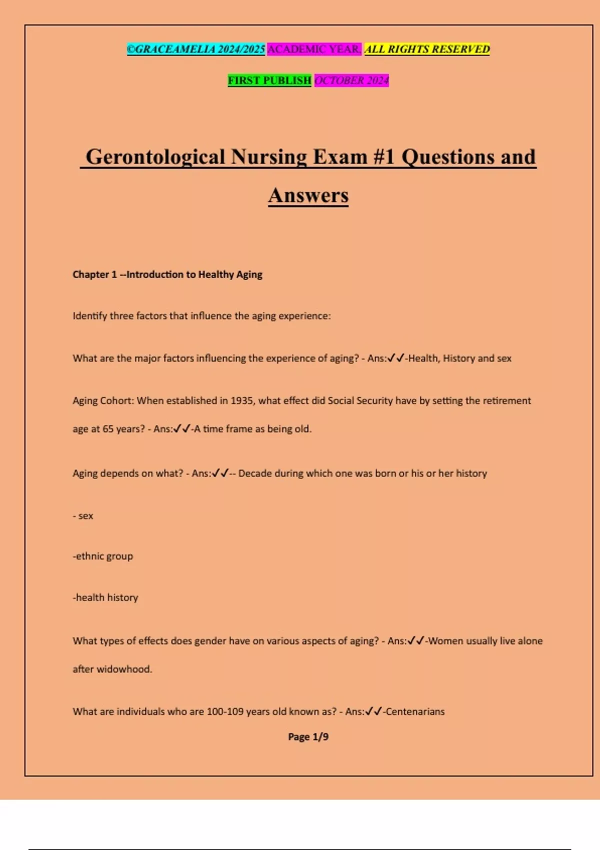 Gerontological Nursing Exam #1 Questions and Answers Chapter 1 --Introduction to Healthy Aging Identify three factors that influence the aging experience: What are the major factors influencing the experience of aging? - Ans:-Health, History and sex Aging Cohort: When established in 1935, what effect did Social Security have by setting the retirement age at 65 years? - Ans:-A time frame as being old. Aging depends on what? - Ans:-- Decade during which one was born or his or her history - sex -ethnic group -health history What types of effects does gender have on various aspects of aging? - Ans:-Women usually live alone after widowhood. What are individuals who are 100-109 years old known as? - Ans:-Centenarians ©GRACEAMELIA 2024/2025 ACADEMIC YEAR. ALL RIGHTS RESERVED FIRST PUBLISH OCTOBER 2024 Page 2/9 According to researchers, which characteristic will most centenarians share in the future? - Ans:- Female Define health and wellness within the context of aging and chronic illness: - Ans:-Health: influenced by culture and age Wellness: one's whole being; physical, emotional, mental and spiritual. In differentiating between health and wellness in health care, which statement is true? - Ans:-Health is a broad term encompassing attitudes and behaviors What does wellness involve? - Ans:-Wellness involves achieving a balance between one's internal and external environment and one's emotional, spiritual, social, cultural, and physical processes. Examples of interventions to promote wellness would include all of the following except: - Ans:- psychiatric screenings Which describes the older man who is likely to experience the best overall health and well being? - Ans:-Uses a wheelchair, has peripheral arterial disease, attends weekly baseball games with three friends. Describe the trends seen in global aging today: which cultural group is predicted to have the fastest growing older adult population in the US between the years 2010 and 205
