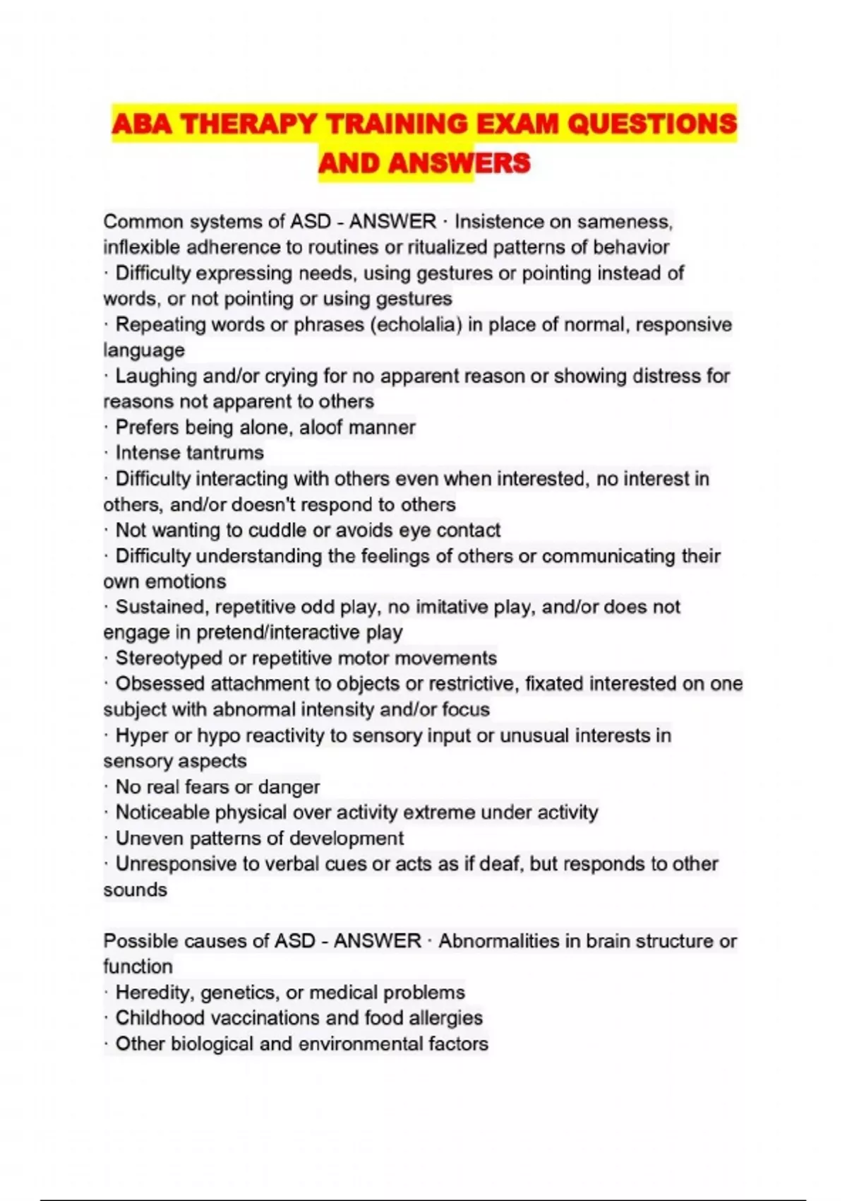 ABA THERAPY TRAINING EXAM QUESTIONS AND ANSWERS...