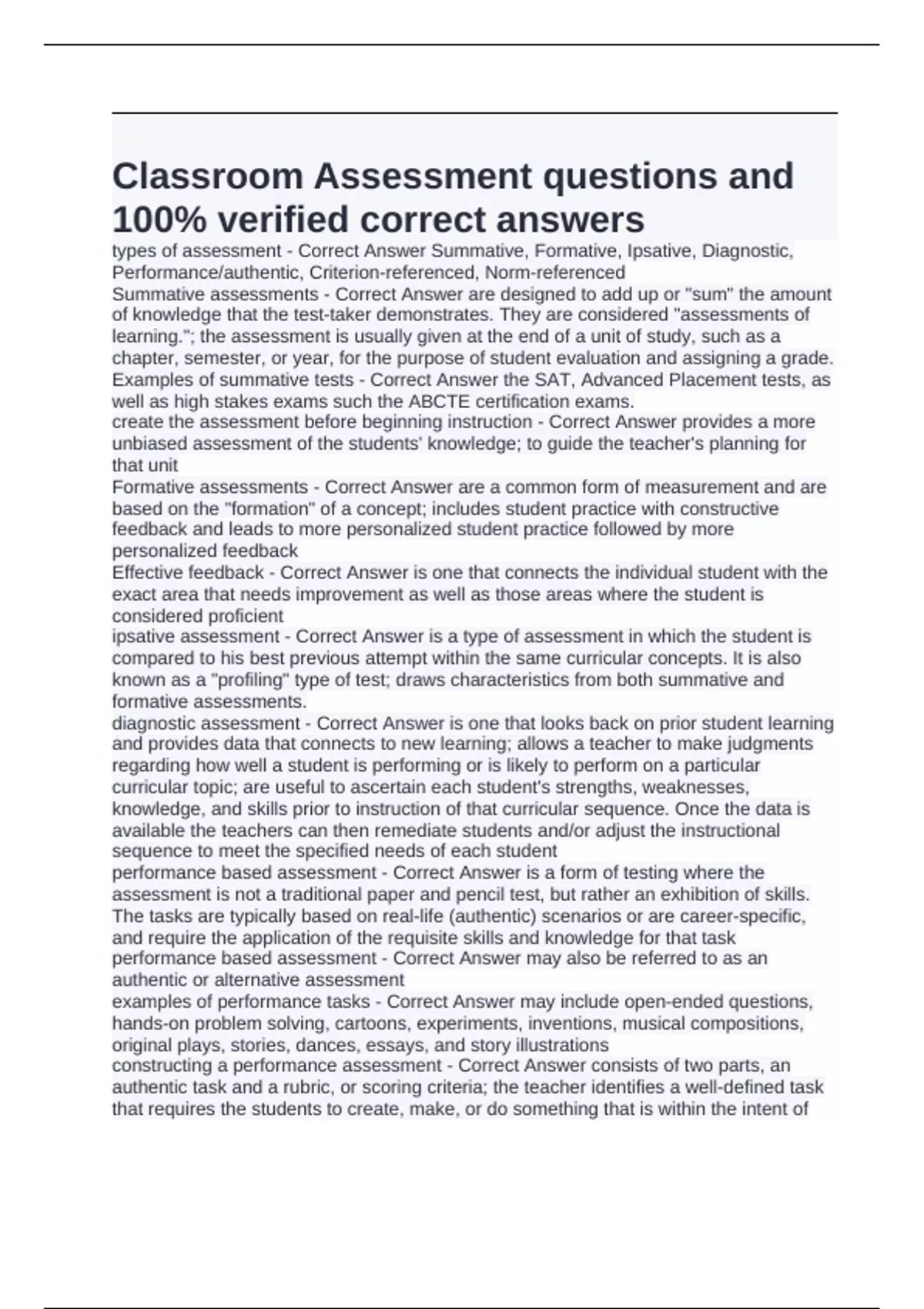 types of assessment - Correct Answer Summative, Formative, Ipsative, Diagnostic,