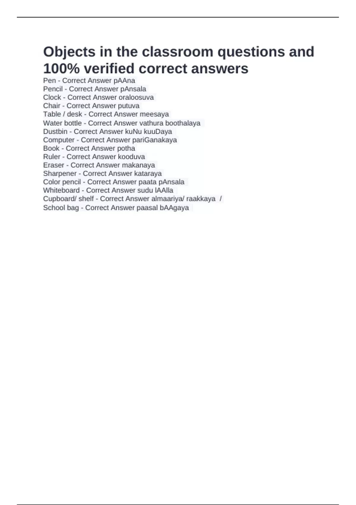 Objects in the classroom questions and 100% verified correct answers Pen - Correct Answer pAAna පෑන Pencil - Correct Answer pAnsala පැන්සල Clock - Correct Answer oraloosuva ඔරෙලෝසුව Chair - Correct Answer putuva පුටුව Table / desk - Correct Answer meesaya මේසය Water bottle - Correct Answer vathura boothalaya වතුර බෝතලය Dustbin - Correct Answer kuNu kuuDaya කුණු කූඩය Computer - Correct Answer pariGanakaya පරිඝණකය Book - Correct Answer potha පොත Ruler - Correct Answer kooduva කෝදුව Eraser - Correct Answer makanaya මකනය Sharpener - Correct Answer kataraya කටරය Color pencil - Correct Answer paata pAnsala පාට පැන්සල Whiteboard - Correct Answer sudu lAAlla සුදු ලෑල්ල Cupboard/ shelf - Correct Answer almaariya/ raakkaya අල්මාරිය / රාක්කය School bag - Correct Answer paasal bAAgaya පාසල් බෑගය