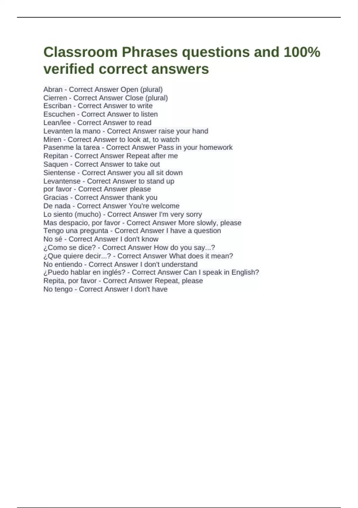 Classroom Phrases questions and 100% verified correct answers Abran - Correct Answer Open (plural) Cierren - Correct Answer Close (plural) Escriban - Correct Answer to write Escuchen - Correct Answer to listen Lean/lee - Correct Answer to read Levanten la mano - Correct Answer raise your hand Miren - Correct Answer to look at, to watch Pasenme la tarea - Correct Answer Pass in your homework Repitan - Correct Answer Repeat after me Saquen - Correct Answer to take out Sientense - Correct Answer you all sit down Levantense - Correct Answer to stand up por favor - Correct Answer please Gracias - Correct Answer thank you De nada - Correct Answer You're welcome Lo siento (mucho) - Correct Answer I'm very sorry Mas despacio, por favor - Correct Answer More slowly, please Tengo una pregunta - Correct Answer I have a question No sé - Correct Answer I don't know ¿Como se dice? - Correct Answer How do you say...? ¿Que quiere decir...? - Correct Answer What does it mean? No entiendo - Correct Answer I don't understand ¿Puedo hablar en inglés? - Correct Answer Can I speak in English? Repita, por favor - Correct Answer Repeat, please No tengo - Correct Answer I don't have