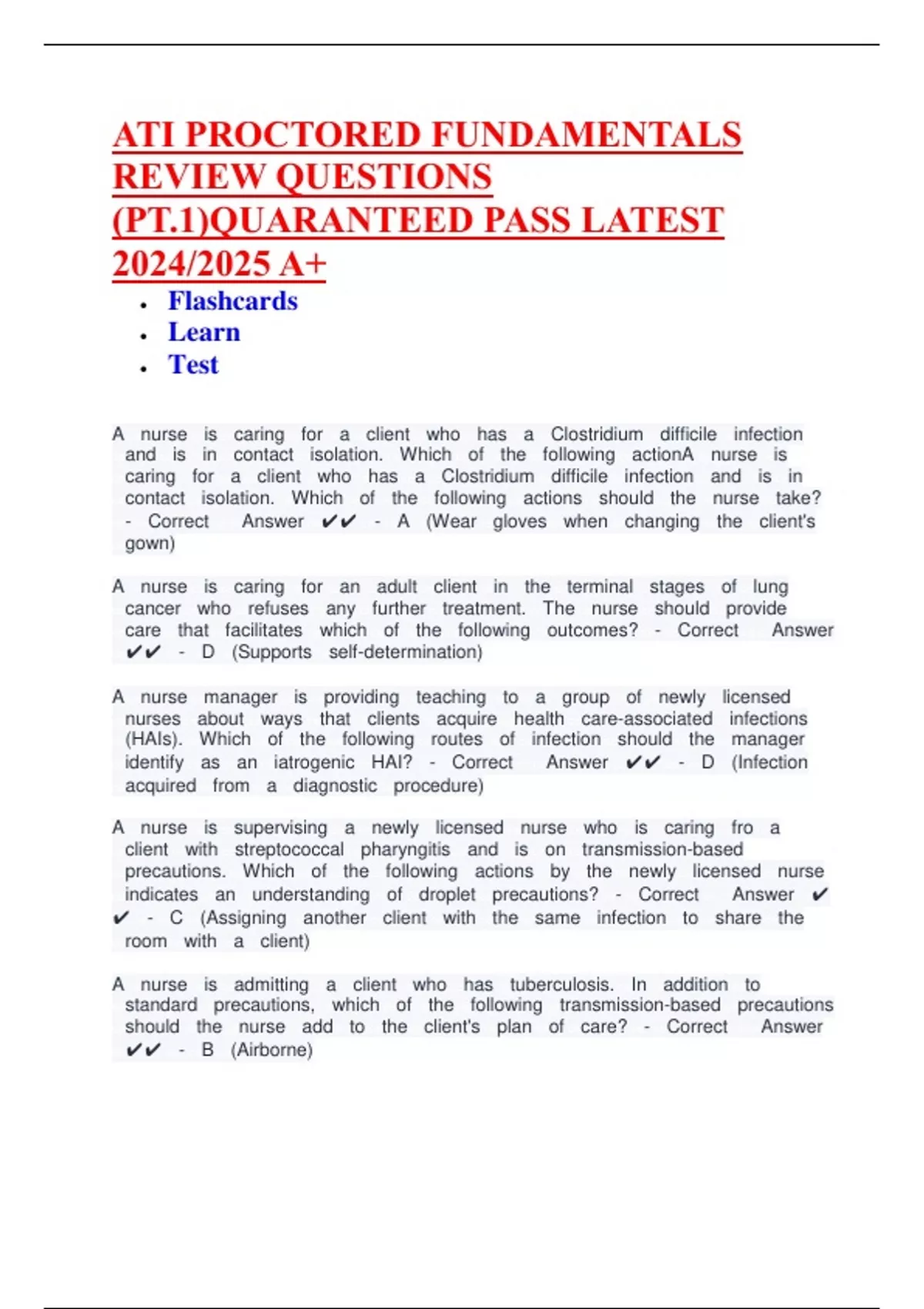 ATI PROCTORED FUNDAMENTALS REVIEW QUESTIONS (PT.1)QUARANTEED PASS LATEST 2024/2025 A+ • Flashcards • Learn • Test ce A cenurse ceis cecaring cefor cea ceclient cewho cehas cea ceClostridium cedifficile ceinfection ceand ceis cein cecontact ceisolation. ceWhich ceof cethe cefollowing ceactionA cenurse ceis cecaring cefor cea ceclient cewho cehas cea ceClostridium cedifficile ceinfection ceand ceis cein cecontact ceisolation. ceWhich ceof cethe cefollowing ceactions ceshould cethe cenurse cetake? ce- ceCorrect ce ceAnswer ce ce- ceA ce(Wear cegloves cewhen cechanging cethe ceclient's cegown) A cenurse ceis cecaring cefor cean ceadult ceclient cein cethe ceterminal cestages ceof celung cecancer cewho cerefuses ceany cefurther cetreatment. ceThe cenurse ceshould ceprovide cecare cethat cefacilitates cewhich ceof cethe cefollowing ceoutcomes? ce- ceCorrect ce ceAnswer ce ce- ceD ce(Supports ceself-determination) A cenurse cemanager ceis ceproviding ceteaching ceto cea cegroup ceof cenewly celicensed cenurses ceabout ceways cethat ceclients ceacquire cehealth cecare-associated ceinfections ce(HAIs). ceWhich ceof cethe cefollowing ceroutes ceof ceinfection ceshould cethe cemanager ceidentify ceas cean ceiatrogenic ceHAI? ce- ceCorrect ce ceAnswer ce ce- ceD ce(Infection ceacquired cefrom cea cediagnostic ceprocedure) A cenurse ceis cesupervising cea cenewly celicensed cenurse cewho ceis cecaring cefro cea ceclient cewith cestreptococcal cepharyngitis ceand ceis ceon cetransmission-based ceprecautions. ceWhich ceof cethe cefollowing ceactions ceby cethe cenewly celicensed cenurse ceindicates cean ceunderstanding ceof cedroplet ceprecautions? ce- ceCorrect ce ceAnswer ce ce- ceC ce(Assigning ceanother ceclient cewith cethe cesame ceinfection ceto ceshare cethe ceroom cewith cea ceclient) A cenurse ceis ceadmitting cea ceclient cewho cehas cetuberculosis. ceIn ceaddition ceto cestandard ceprecautions, cewhich ceof cethe cefollowing cetransmission-based ceprecautions ceshould cethe cenurse ceadd ceto cethe ceclient's ceplan ceof cecare? ce- ceCorrect ce ceAnswer ce ce- ceB ce(Airborne) ATI PROCTORED FUNDAMENTALS REVIEW QUESTIONS (PT.1)QUARANTEED PASS LATEST 2024/2025 A+ • Flashcards • Learn • Test ce A cenurse ceis cecaring cefor cea ceclient cewho cehas cea ceClostridium cedifficile ceinfection ceand ceis cein cecontact ceisolation. ceWhich ceof cethe cefollowing ceactionA cenurse ceis cecaring cefor cea ceclient cewho cehas cea ceClostridium cedifficile ceinfection ceand ceis cein cecontact ceisolation. ceWhich ceof cethe cefollowing ceactions ceshould cethe cenurse cetake? ce- ceCorrect ce ceAnswer ce ce- ceA ce(Wear cegloves cewhen cechanging cethe ceclient's cegown) A cenurse ceis cecaring cefor cean ceadult ceclient cein cethe ceterminal cestages ceof celung cecancer cewho cerefuses ceany cefurther cetreatment. ceThe cenurse ceshould ceprovide cecare cethat cefacilitates cewhich ceof cethe cefollowing ceoutcomes? ce- ceCorrect ce ceAnswer ce ce- ceD ce(Supports ceself-determination) A cenurse cemanager ceis ceproviding ceteaching ceto cea cegroup ceof cenewly celicensed cenurses ceabout ceways cethat ceclients ceacquire cehealth cecare-associated ceinfections ce(HAIs). ceWhich ceof cethe cefollowing ceroutes ceof ceinfection ceshould cethe cemanager ceidentify ceas cean ceiatrogenic ceHAI? ce- ceCorrect ce ceAnswer ce ce- ceD ce(Infection ceacquired cefrom cea cediagnostic ceprocedure) A cenurse ceis cesupervising cea cenewly celicensed cenurse cewho ceis cecaring cefro cea ceclient cewith cestreptococcal cepharyngitis ceand ceis ceon cetransmission-based ceprecautions. ceWhich ceof cethe cefollowing ceactions ceby cethe cenewly celicensed cenurse ceindicates cean ceunderstanding ceof cedroplet ceprecautions? ce- ceCorrect ce ceAnswer ce ce- ceC ce(Assigning ceanother ceclient cewith cethe cesame ceinfection ceto ceshare cethe ceroom cewith cea ceclient) A cenurse ceis ceadmitting cea ceclient cewho cehas cetuberculosis. ceIn ceaddition ceto cestandard ceprecautions, cewhich ceof cethe cefollowing cetransmission-based ceprecautions ceshould cethe cenurse ceadd ceto cethe ceclient's ceplan ceof cecare? ce- ceCorrect ce ceAnswer ce ce- ceB ce(Airborne) ATI PROCTORED FUNDAMENTALS REVIEW QUESTIONS (PT.1)QUARANTEED PASS LATEST 2024/2025 A+ • Flashcards • Learn • Test ce A cenurse ceis cecaring cefor cea ceclient cewho cehas cea ceClostridium cedifficile ceinfection ceand ceis cein cecontact ceisolation. ceWhich ceof cethe cefollowing ceactionA cenurse ceis cecaring cefor cea ceclient cewho cehas cea ceClostridium cedifficile ceinfection ceand ceis cein cecontact ceisolation. ceWhich ceof cethe cefollowing ceactions ceshould cethe cenurse cetake? ce- ceCorrect ce ceAnswer ce ce- ceA ce(Wear cegloves cewhen cechanging cethe ceclient's cegown) A cenurse ceis cecaring cefor cean ceadult ceclient cein cethe ceterminal cestages ceof celung cecancer cewho cerefuses ceany cefurther cetreatment. ceThe cenurse ceshould ceprovide cecare cethat cefacilitates cewhich ceof cethe cefollowing ceoutcomes? ce- ceCorrect ce ceAnswer ce ce- ceD ce(Supports ceself-determination) A cenurse cemanager ceis ceproviding ceteaching ceto cea cegroup ceof cenewly celicensed cenurses ceabout ceways cethat ceclients ceacquire cehealth cecare-associated ceinfections ce(HAIs). ceWhich ceof cethe cefollowing ceroutes ceof ceinfection ceshould cethe cemanager ceidentify ceas cean ceiatrogenic ceHAI? ce- ceCorrect ce ceAnswer ce ce- ceD ce(Infection ceacquired cefrom cea cediagnostic ceprocedure) A cenurse ceis cesupervising cea cenewly celicensed cenurse cewho ceis cecaring cefro cea ceclient cewith cestreptococcal cepharyngitis ceand ceis ceon cetransmission-based ceprecautions. ceWhich ceof cethe cefollowing ceactions ceby cethe cenewly celicensed cenurse ceindicates cean ceunderstanding ceof cedroplet ceprecautions? ce- ceCorrect ce ceAnswer ce ce- ceC ce(Assigning ceanother ceclient cewith cethe cesame ceinfec