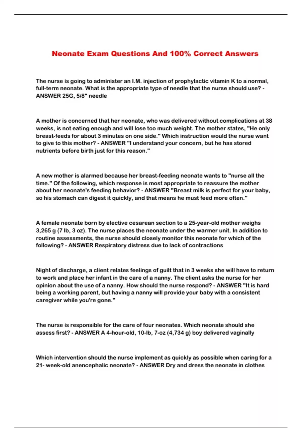 Neonate Exam Questions And 100% Correct Answers