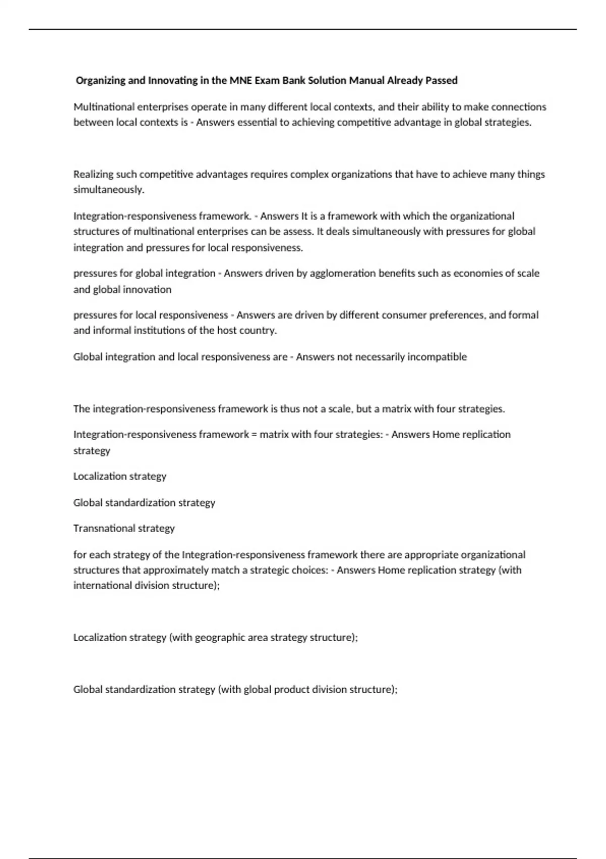 Integration-responsiveness framework = matrix with four strategies: - Answers Home replication