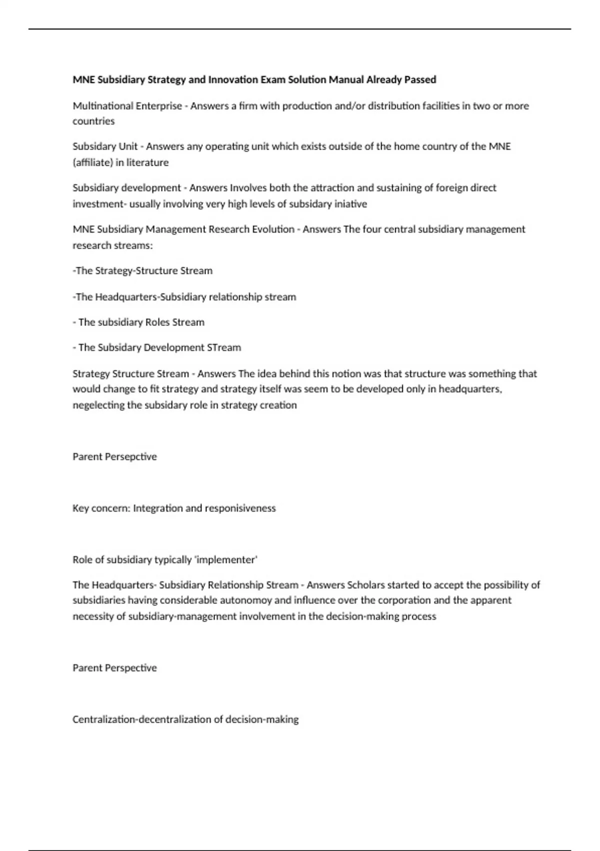 MNE Subsidiary Strategy and Innovation Exam Solution Manual Already Passed