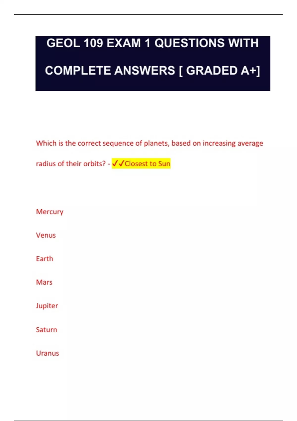 GEOL 109 EXAM 1 QUESTIONS WITH COMPLETE ANSWERS [ GRADED A+] Which is the correct sequence of planets, based on increasing average radius of their orbits? - Closest to Sun Mercury Venus Earth Mars Jupiter Saturn Uranus