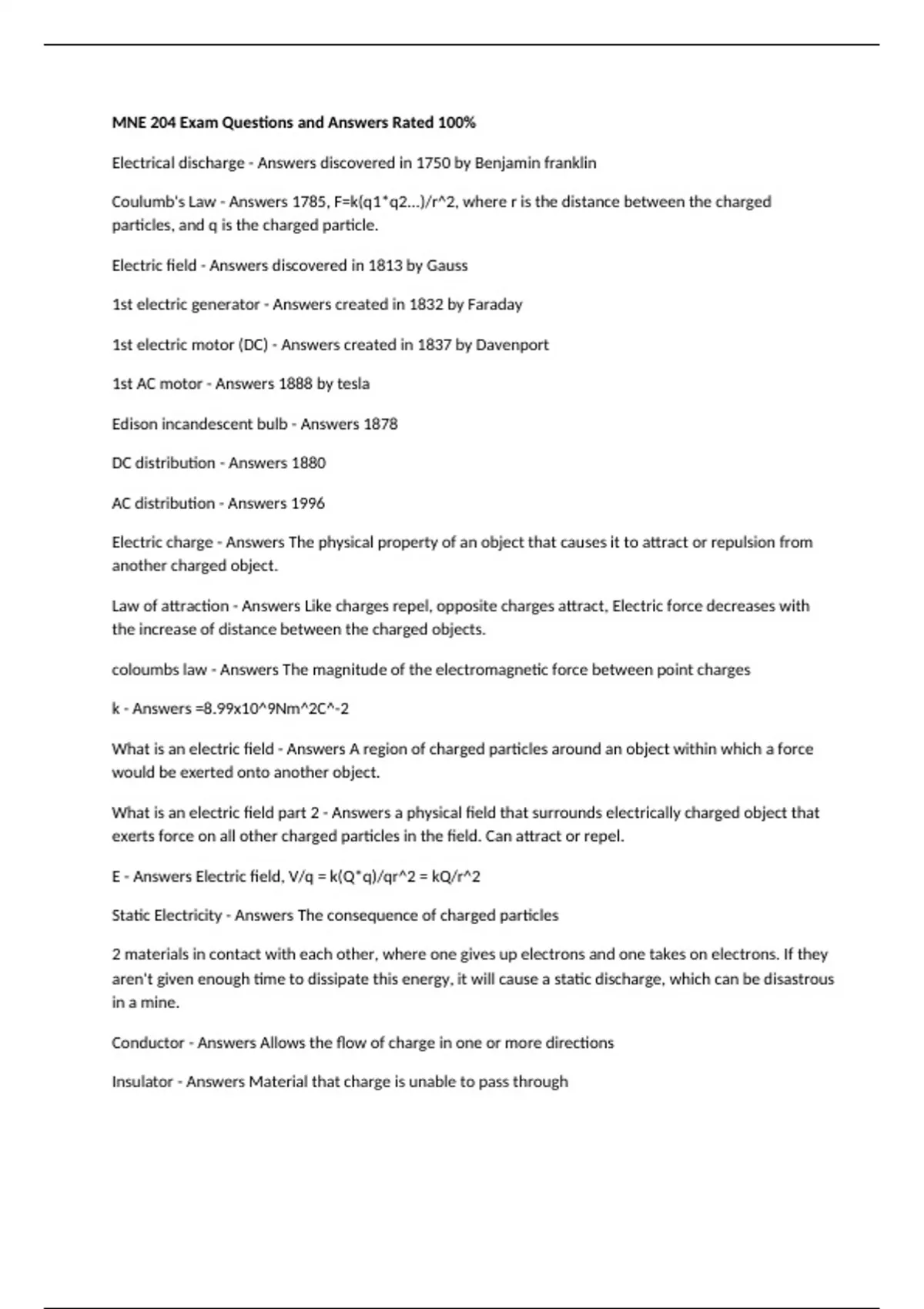 MNE 204 Exam Questions and Answers Rated 100% Electrical discharge - Answers discovered in 1750 by Benjamin franklin Coulumb's Law - Answers 1785, F=k(q1*q2...)/r^2, where r is the distance between the charged particles, and q is the charged particle. Electric field - Answers discovered in 1813 by Gauss 1st electric generator - Answers created in 1832 by Faraday 1st electric motor (DC) - Answers created in 1837 by Davenport 1st AC motor - Answers 1888 by tesla Edison incandescent bulb - Answers 1878 DC distribution - Answers 1880 AC distribution - Answers 1996 Electric charge - Answers The physical property of an object that causes it to attract or repulsion from another charged object. Law of attraction - Answers Like charges repel, opposite charges attract, Electric force decreases with the increase of distance between the charged objects. coloumbs law - Answers The magnitude of the electromagnetic force between point charges k - Answers =8.99x10^9Nm^2C^-2 What is an electric field - Answers A region of charged particles around an object within which a force would be exerted onto another object. What is an electric field part 2 - Answers a physical field that surrounds electrically charged object that exerts force on all other charged particles in the field. Can attract or repel. E - Answers Electric field, V/q = k(Q*q)/qr^2 = kQ/r^2 Static Electricity - Answers The consequence of charged particles 2 materials in contact with each other, where one gives up electrons and one takes on electrons. If they aren't given enough time to dissipate this energy, it will cause a static discharge, which can be disastrous in a mine. Conductor - Answers Allows the flow of charge in one or more directions Insulator - Answers Material that charge is unable to pass through The Energy Gap - Answers Is the distance between the conduction band and the valence band. electrostatic equilibrium - Answers charges respond to reach a steady state.