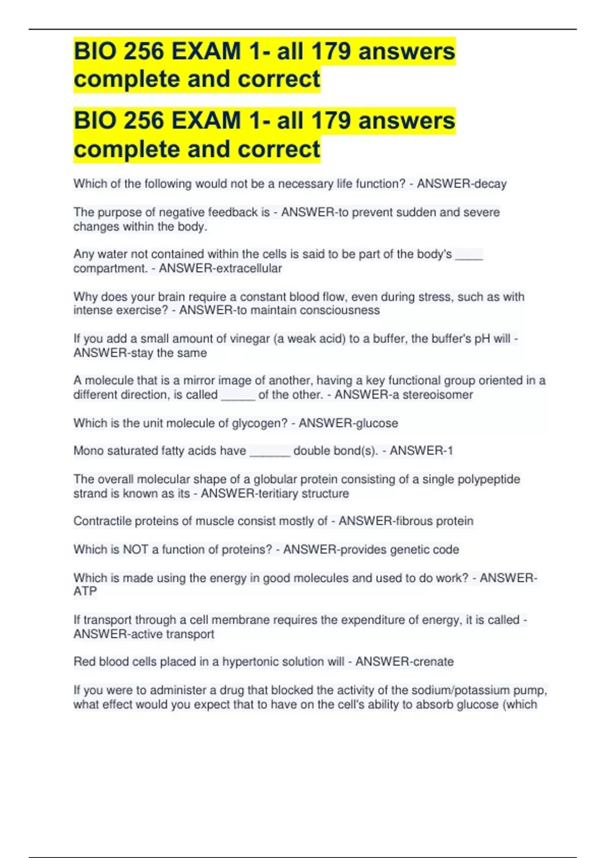 , BIO 256 EXAM 1- all 179 answers