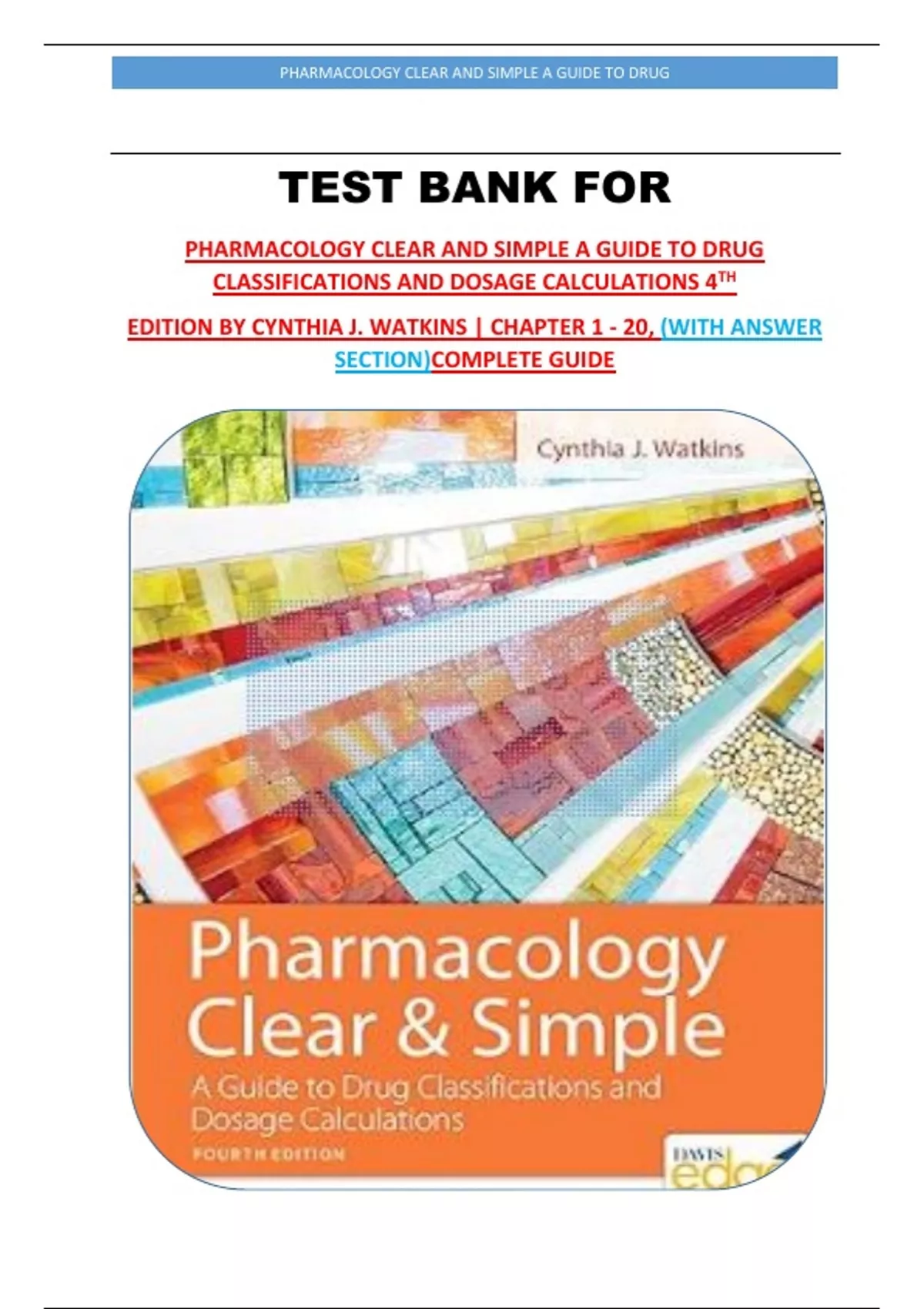 Test Bank - Pharmacology Clear And Simple A Guide To Drug Classifications And Dosage Calculations 4th