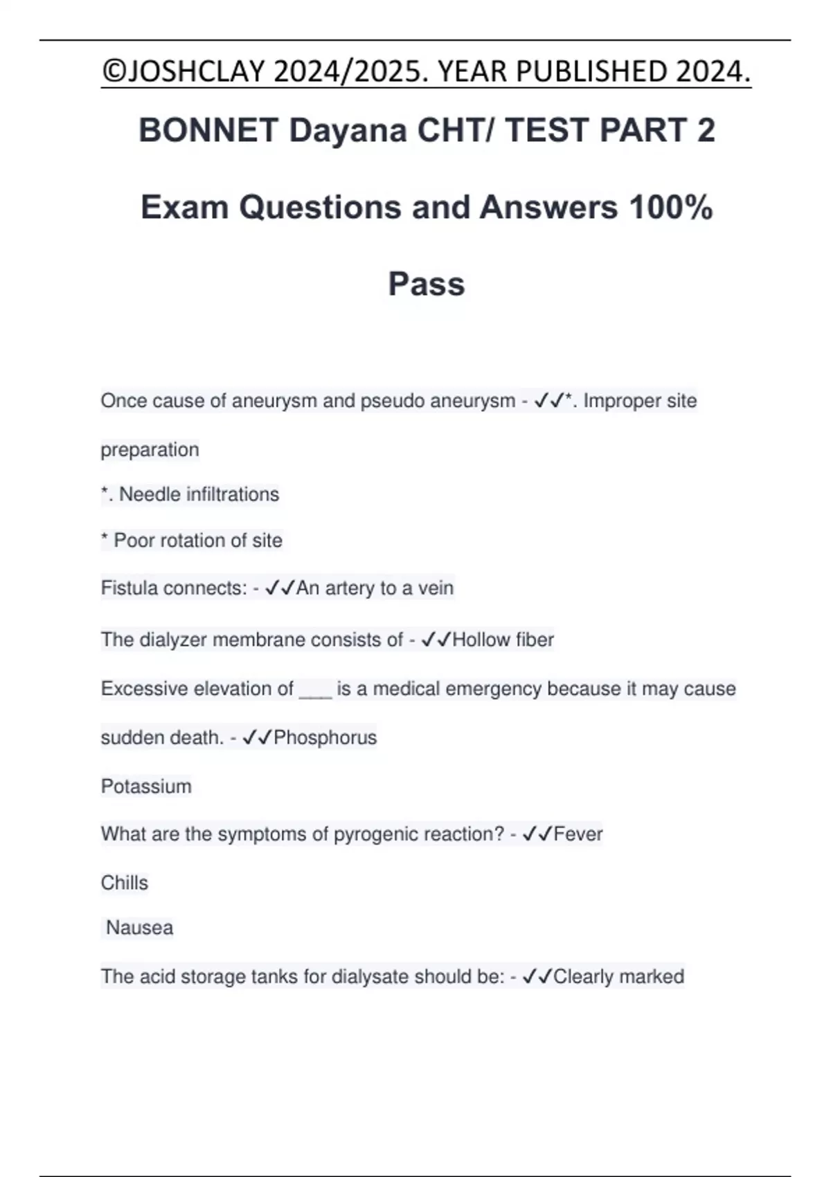 BONNET Dayana CHT/ TEST PART 2 Exam Questions and Answers 100% Pass Once cause of aneurysm and pseudo aneurysm - *. Improper site preparation *. Needle infiltrations * Poor rotation of site Fistula connects: - An artery to a vein The dialyzer membrane consists of - Hollow fiber Excessive elevation of ___ is a medical emergency because it may cause sudden death. - Phosphorus Potassium What are the symptoms of pyrogenic reaction? - Fever Chills Nausea The acid storage tanks for dialysate should be: - Clearly marked