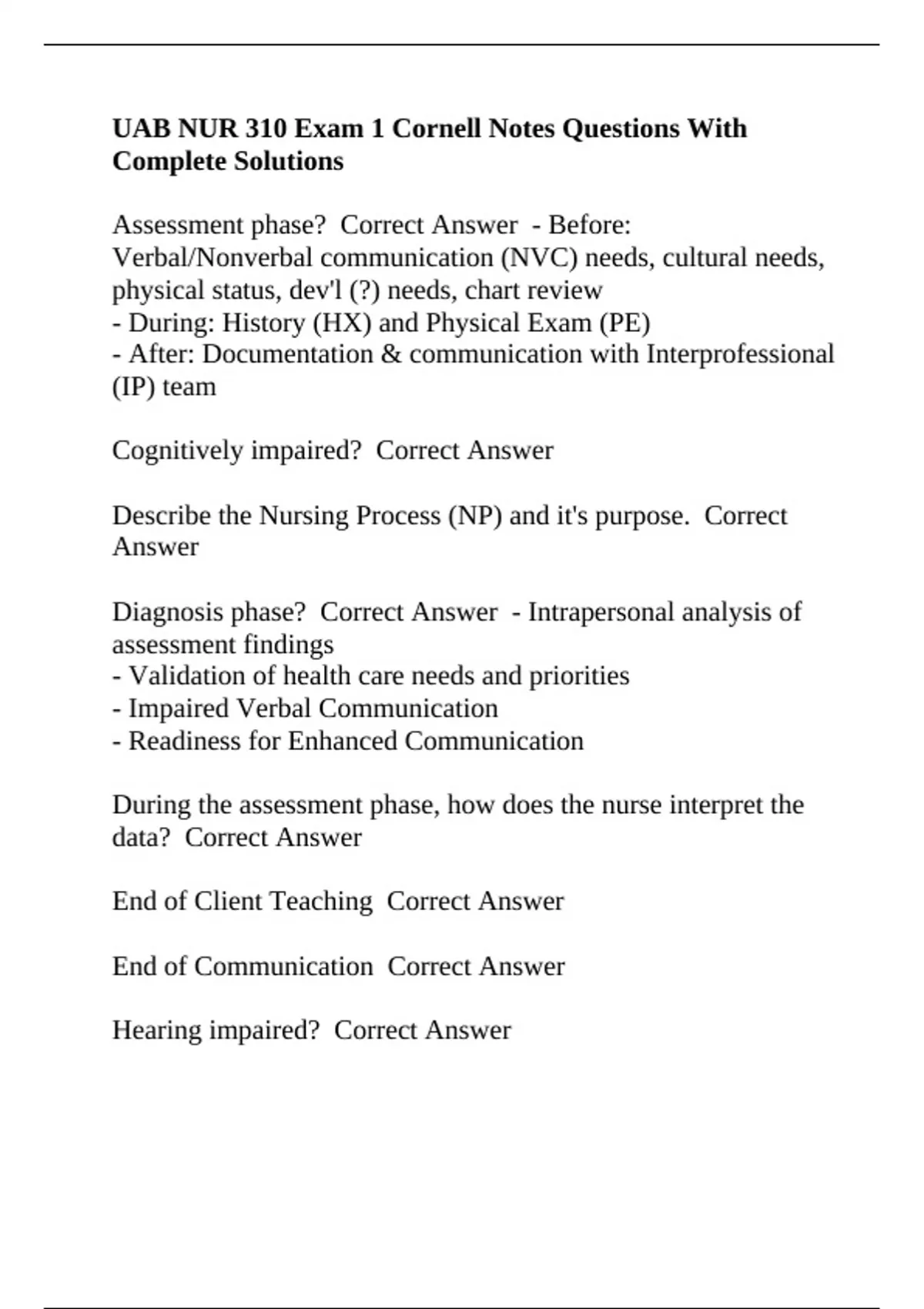 UAB NUR 310 Exam 1 Cornell Notes Questions With Complete Solutions