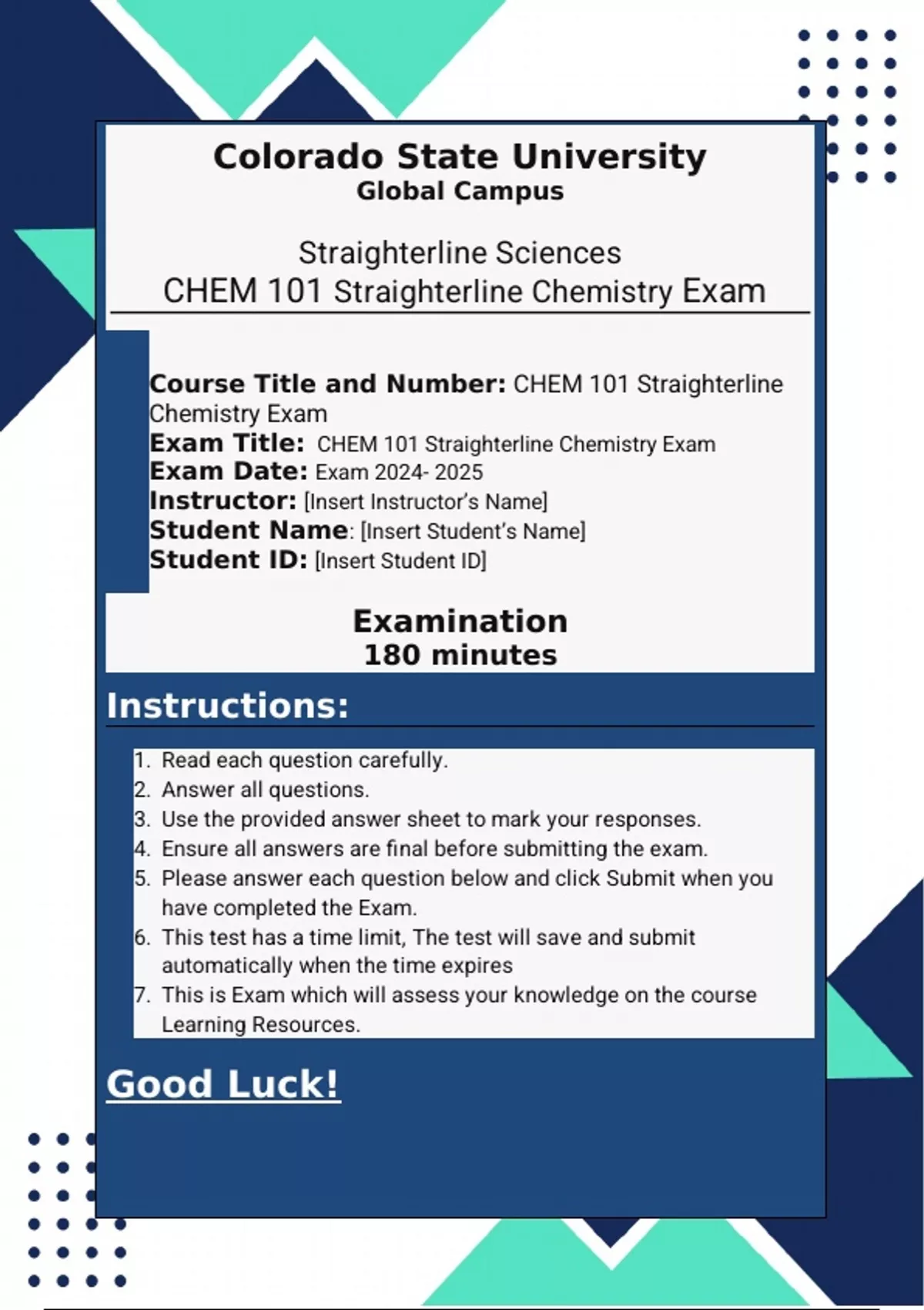 Exam Title: CHEM 101 Straighterline Chemistry Exam