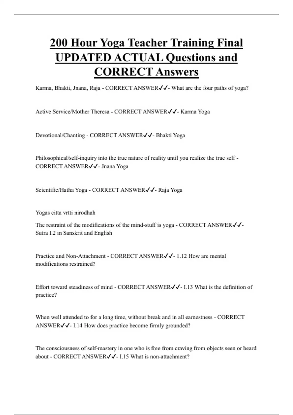 200 Hour Yoga Teacher Training Final Exam UPDATED ACTUAL Questions and CORRECT Answers