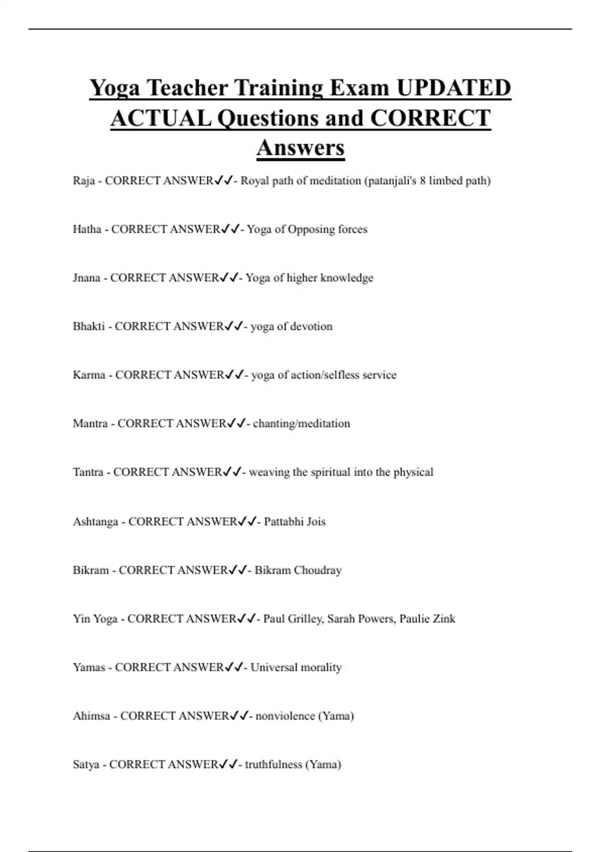 Yoga Teacher Training Exam UPDATED ACTUAL Questions and CORRECT Answers