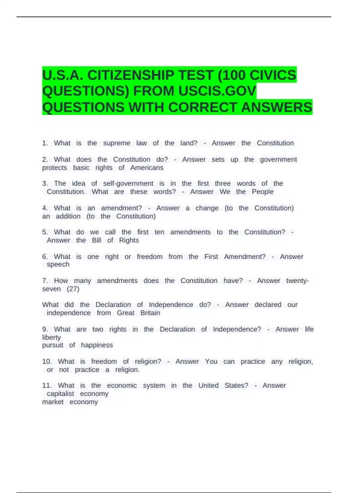 U.S.A. CITIZENSHIP TEST (100 CIVICS QUESTIONS) FROM USCIS.GOV QUESTIONS WITH CORRECT ANSWERS.