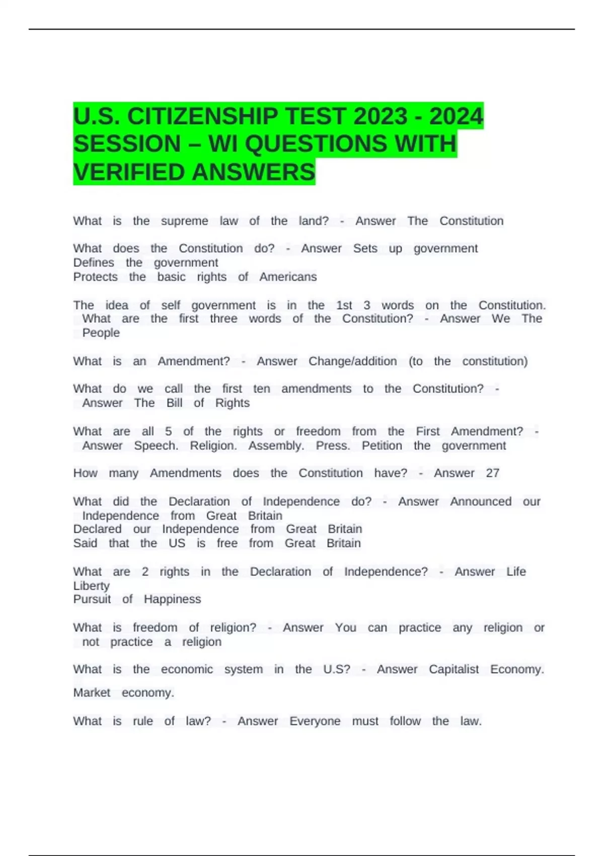 U.S. CITIZENSHIP TEST SESSION – WI QUESTIONS WITH VERIFIED ANSWERS