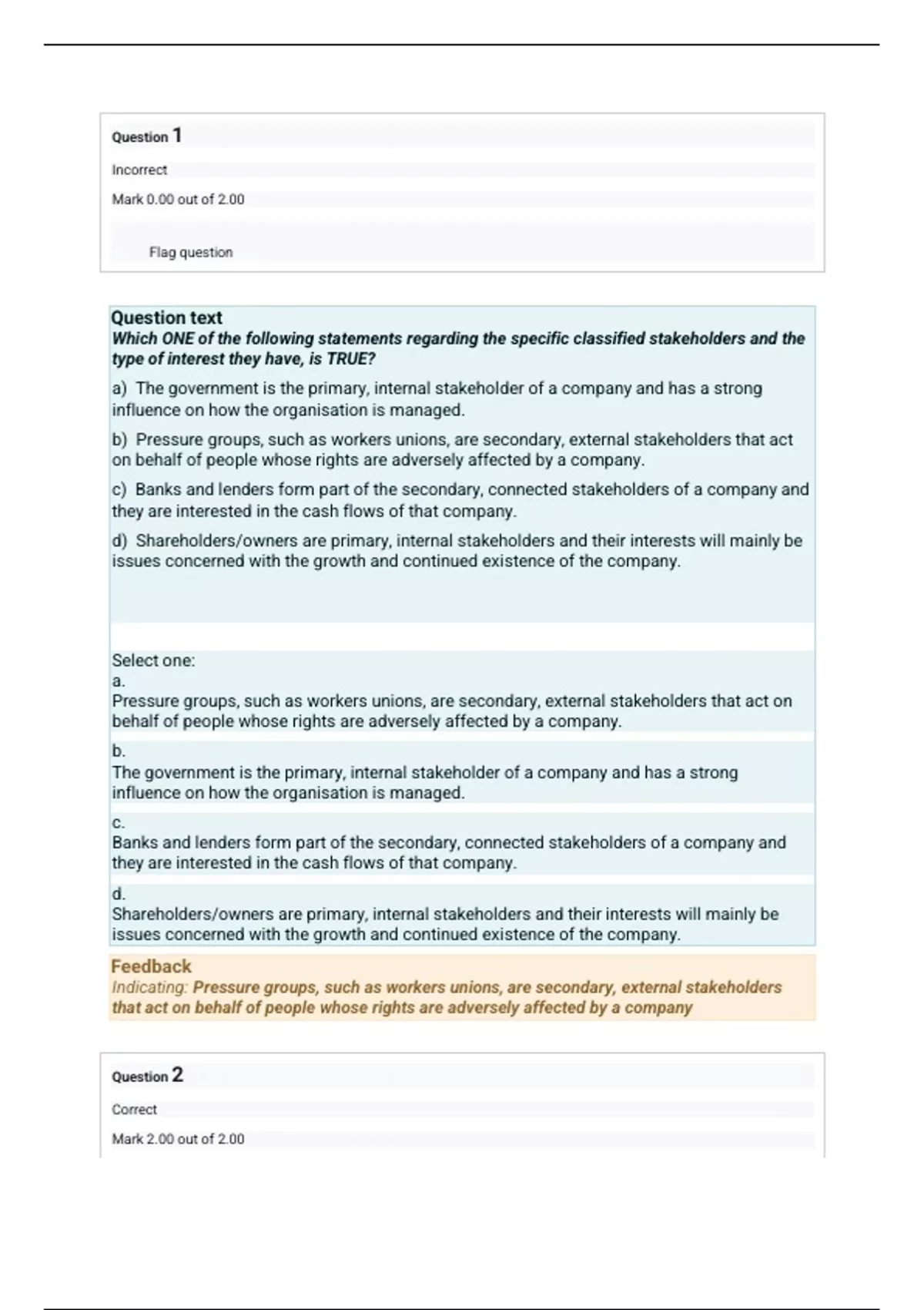 a) The government is the primary, internal stakeholder of a company and has a strong