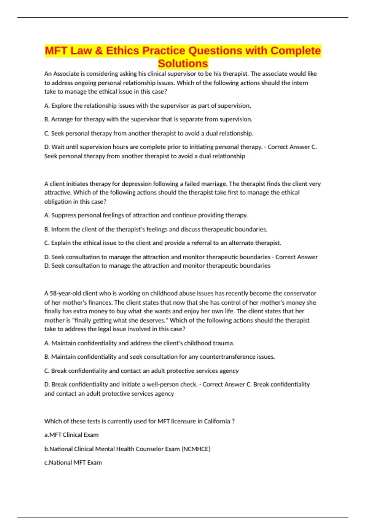 MFT Law & Ethics Practice Questions with Complete Solutions An Associate is considering asking his clinical supervisor to be his therapist. The associate would like to address ongoing personal relationship issues. Which of the following actions should the intern take to manage the ethical issue in this case? A. Explore the relationship issues with the supervisor as part of supervision. B. Arrange for therapy with the supervisor that is separate from supervision. C. Seek personal therapy from another therapist to avoid a dual relationship. D. Wait until supervision hours are complete prior to initiating personal therapy. - Correct Answer C. Seek personal therapy from another therapist to avoid a dual relationship A client initiates therapy for depression following a failed marriage. The therapist finds the client very attractive. Which of the following actions should the therapist take first to manage the ethical obligation in this case? A. Suppress personal feelings of attraction and continue providing therapy. B. Inform the client of the therapist's feelings and discuss therapeutic boundaries. C. Explain the ethical issue to the client and provide a referral to an alternate therapist. D. Seek consultation to manage the attraction and monitor therapeutic boundaries - Correct Answer D. Seek consultation to manage the attraction and monitor therapeutic boundaries A 58-year-old client who is working on childhood abuse issues has recently become the conservator of her mother's finances. The client states that now that she has control of her mother's money she finally has extra money to buy what she wants and enjoy her own life. The client states that her mother is "finally getting what she deserves." Which of the following actions should the therapist take to address the legal issue involved in this case? A. Maintain confidentiality and address the client's childhood trauma. B. Maintain confidentiality and seek consultation for any countertransference issues. C. Break confidentiality and contact an adult protective services agency D. Break confidentiality and initiate a well-person check. - Correct Answer C. Break confidentiality and contact an adult protective services agency Which of these tests is currently used for MFT licensure in California ? a.MFT Clinical Exam b.National Clinical Mental Health Counselor Exam (NCMHCE) c.National MFT Exam d.California Family Therapy Exam for Licensure (CFTEL) - Correct Answer a.MFT Clinical Exam The therapist has a client whom he has been seeing for the past year. The client struggles with OCD