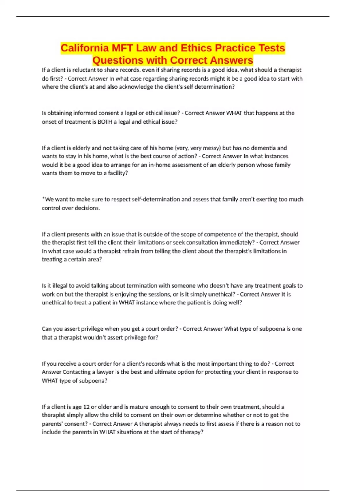 California MFT Law and Ethics Practice Tests Questions with Correct Answers If a client is reluctant to share records, even if sharing records is a good idea, what should a therapist do first? - Correct Answer In what case regarding sharing records might it be a good idea to start with where the client's at and also acknowledge the client's self determination? Is obtaining informed consent a legal or ethical issue? - Correct Answer WHAT that happens at the onset of treatment is BOTH a legal and ethical issue? If a client is elderly and not taking care of his home (very, very messy) but has no dementia and wants to stay in his home, what is the best course of action? - Correct Answer In what instances would it be a good idea to arrange for an in-home assessment of an elderly person whose family wants them to move to a facility? *We want to make sure to respect self-determination and assess that family aren't exerting too much control over decisions. If a client presents with an issue that is outside of the scope of competence of the therapist, should the therapist first tell the client their limitations or seek consultation immediately? - Correct Answer In what case would a therapist refrain from telling the client about the therapist's limitations in treating a certain area? Is it illegal to avoid talking about termination with someone who doesn't have any treatment goals to work on but the therapist is enjoying the sessions, or is it simply unethical? - Correct Answer It is unethical to treat a patient in WHAT instance where the patient is doing well? Can you assert privilege when you get a court order? - Correct Answer What type of subpoena is one that a therapist wouldn't assert privilege for? If you receive a court order for a client's records what is the most important thing to do? - Correct Answer Contacting a lawyer is the best and ultimate option for protecting your client in response to WHAT type of subpoena? If a client is age 12 or older and is mature enough to consent to their own treatment, should a therapist simply allow the child to consent on their own or determine whether or not to get the parents' consent? - Correct Answer A therapist always needs to first assess if there is a reason not to include the parents in WHAT situations at the start of therapy? If a therapist decides no