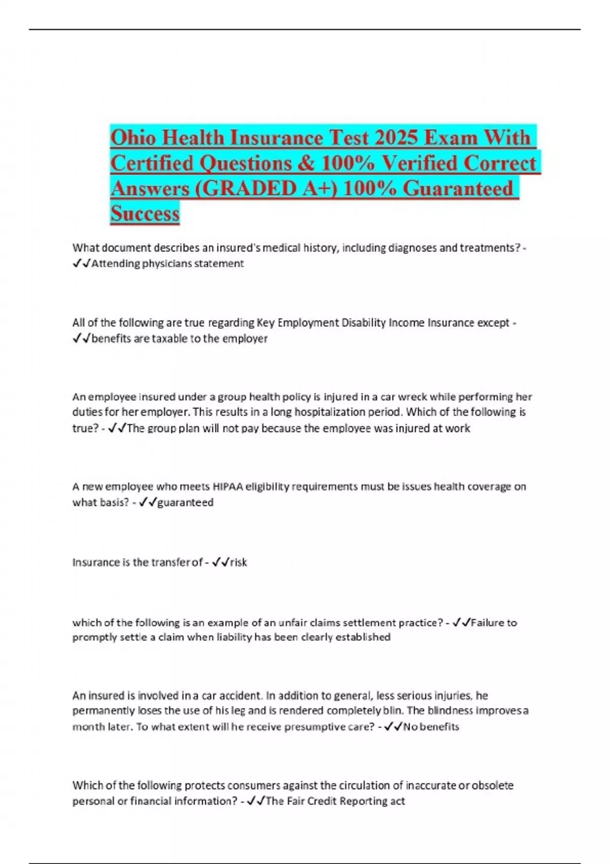 Ohio Health Insurance Test 2025 Exam With Certified Questions & 100% Verified Correct Answers (GRADED A+) 100% Guaranteed Success