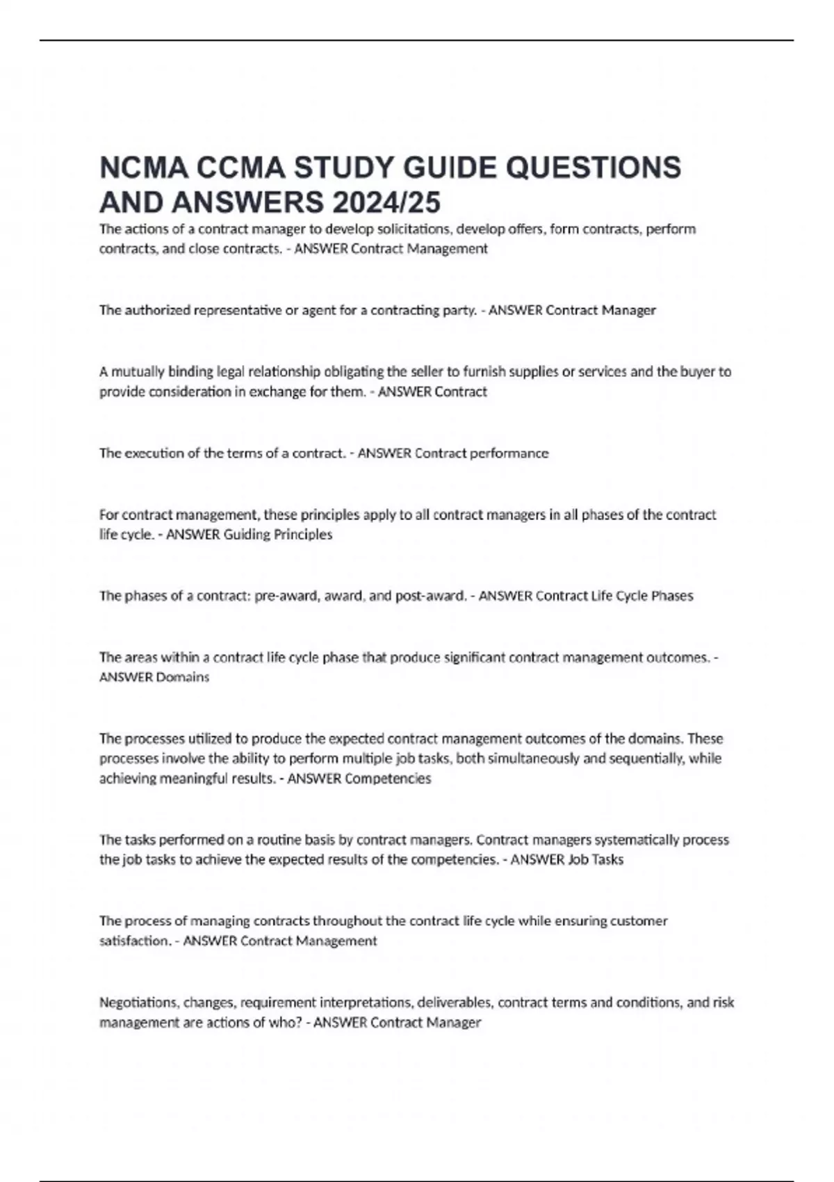 NCMA CCMA STUDY GUIDE QUESTIONS AND ANSWERS 2024/25 The actions of a contract manager to develop solicitations, develop offers, form contracts, perform contracts, and close contracts. - ANSWER Contract Management The authorized representative or agent for a contracting party. - ANSWER Contract Manager A mutually binding legal relationship obligating the seller to furnish supplies or services and the buyer to provide consideration in exchange for them. - ANSWER Contract The execution of the terms of a contract. - ANSWER Contract performance For contract management, these principles apply to all contract managers in all phases of the contract life cycle. - ANSWER Guiding Principles The phases of a contract: pre-award, award, and post-award. - ANSWER Contract Life Cycle Phases