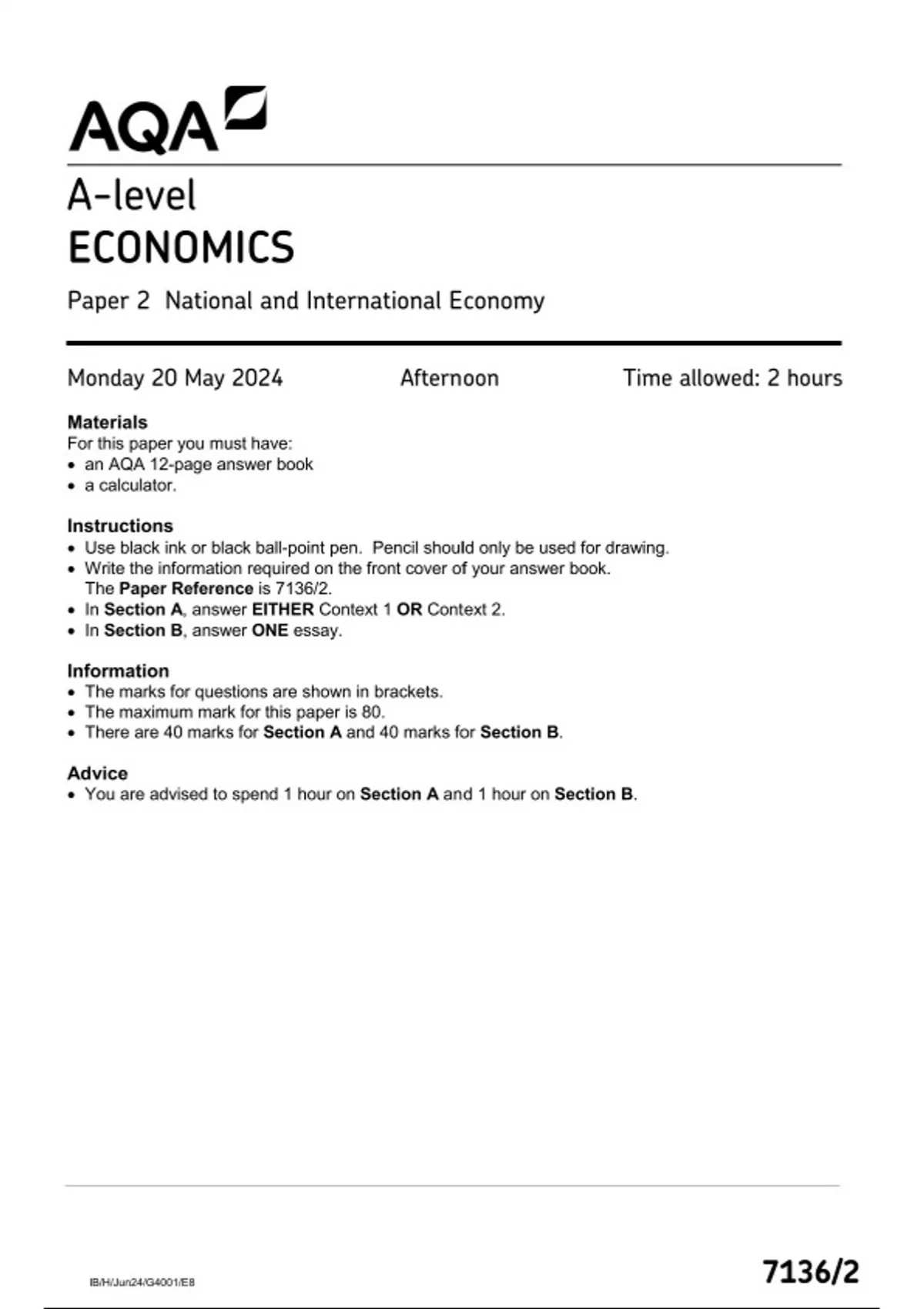 AQA A-level ECONOMICS Paper 2 JUNE 2024 QUESTION PAPER