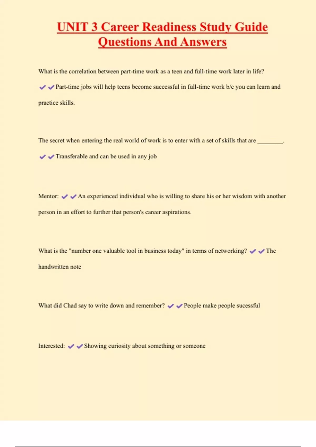 UNIT 3 Career Readiness Study Guide Questions And Answers What is the correlation between part-time work as a teen and full-time work later in life? Part-time jobs will help teens become successful in full-time work b/c you can learn and practice skills. The secret when entering the real world of work is to enter with a set of skills that are ________. Transferable and can be used in any job Mentor: An experienced individual who is willing to share his or her wisdom with another person in an effort to further that person's career aspirations.