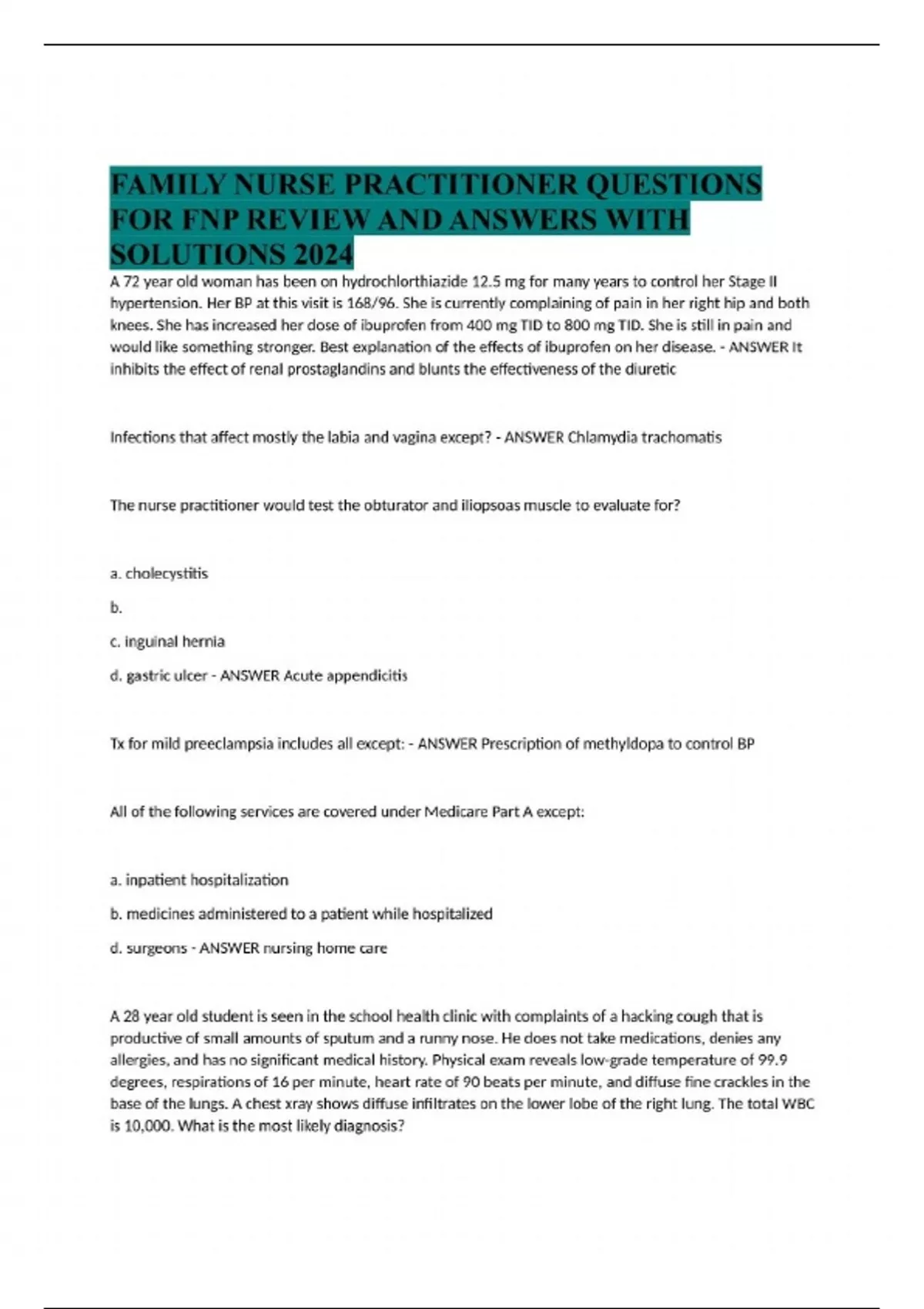 FAMILY NURSE PRACTITIONER QUESTIONS FOR FNP REVIEW AND ANSWERS WITH SOLUTIONS 2024 A 72 year old woman has been on hydrochlorthiazide 12.5 mg for many years to control her Stage II hypertension. Her BP at this visit is 168/96. She is currently complaining of pain in her right hip and both knees. She has increased her dose of ibuprofen from 400 mg TID to 800 mg TID. She is still in pain and would like something stronger. Best explanation of the effects of ibuprofen on her disease. - ANSWER It inhibits the effect of renal prostaglandins and blunts the effectiveness of the diuretic Infections that affect mostly the labia and vagina except? - ANSWER Chlamydia trachomatis The nurse practitioner would test the obturator and iliopsoas muscle to evaluate for? a. cholecystitis b. c. inguinal hernia d. gastric ulcer - ANSWER Acute appendicitis Tx for mild preeclampsia includes all except: - ANSWER Prescription of methyldopa to control BP All of the following services are covered under Medicare Part A except: a. inpatient hospitalization b. medicines administered to a patient while hospitalized d. surgeons - ANSWER nursing home care A 28 year old student is seen in the school health clinic with complaints of a hacking cough that is productive of small amounts of sputum and a runny nose. He does not take medications, denies any allergies, and has no significant medical history. Physical exam reveals low-grade temperature of 99.9 degrees, respirations of 16 per minute, heart rate of 90 beats per minute, and diffuse fine crackles in the base of the lungs. A chest xray shows diffuse infiltrates on the lower lobe of the right lung. The total WBC is 10,000. What is the most likely diagnosis? a. streptococcal pneumonia b. mycoplasma pneumonia c. acute bronchitis d. legionnaire's disease - ANSWER b A 39 year old migrant worker presents to the clinic 2.5 days after a PPD skin test. The minimum size of induration would be considered positive in this patient? a. 3 mm b. 5 mm c. 10 mm d. 15 mm - ANSWER c All of the following are correct statements regarding a durable power of attorney's role except? a. their decisions are legally binding b. it can be used in other areas of a patient's life such as financial issues c. they can decide for the patient who is on life support when it can be terminated d. the patient's spouse has the right to override a durable power of attorney - ANSWER d All of the following are true statements regarding Munchausen syndrome except: