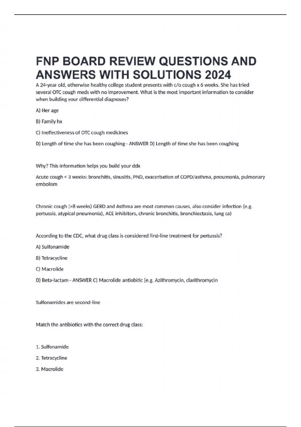 FNP BOARD REVIEW QUESTIONS AND ANSWERS WITH SOLUTIONS 2024 A 24-year old, otherwise healthy college student presents with c/o cough x 6 weeks. She has tried several OTC cough meds with no improvement. What is the most important information to consider when building your differential diagnoses? A) Her age B) Family hx C) Ineffectiveness of OTC cough medicines D) Length of time she has been coughing - ANSWER D) Length of time she has been coughing Why? This information helps you build your ddx Acute cough < 3 weeks: bronchitis, sinusitis, PND, exacerbation of COPD/asthma, pneumonia, pulmonary embolism Chronic cough (>8 weeks) GERD and Asthma are most common causes, also consider infection (e.g. pertussis, atypical pneumonia), ACE inhibitors, chronic bronchitis, bronchiectasis, lung ca) According to the CDC, what drug class is considered first-line treatment for pertussis? A) Sulfonamide B) Tetracycline C) Macrolide D) Beta-lactam - ANSWER C) Macrolide antiobitic (e.g. Azithromycin, clarithromycin Sulfonamides are second-line Match the antibiotics with the correct drug class: 1. Sulfonamide 2. Tetracycline 3. Macrolide