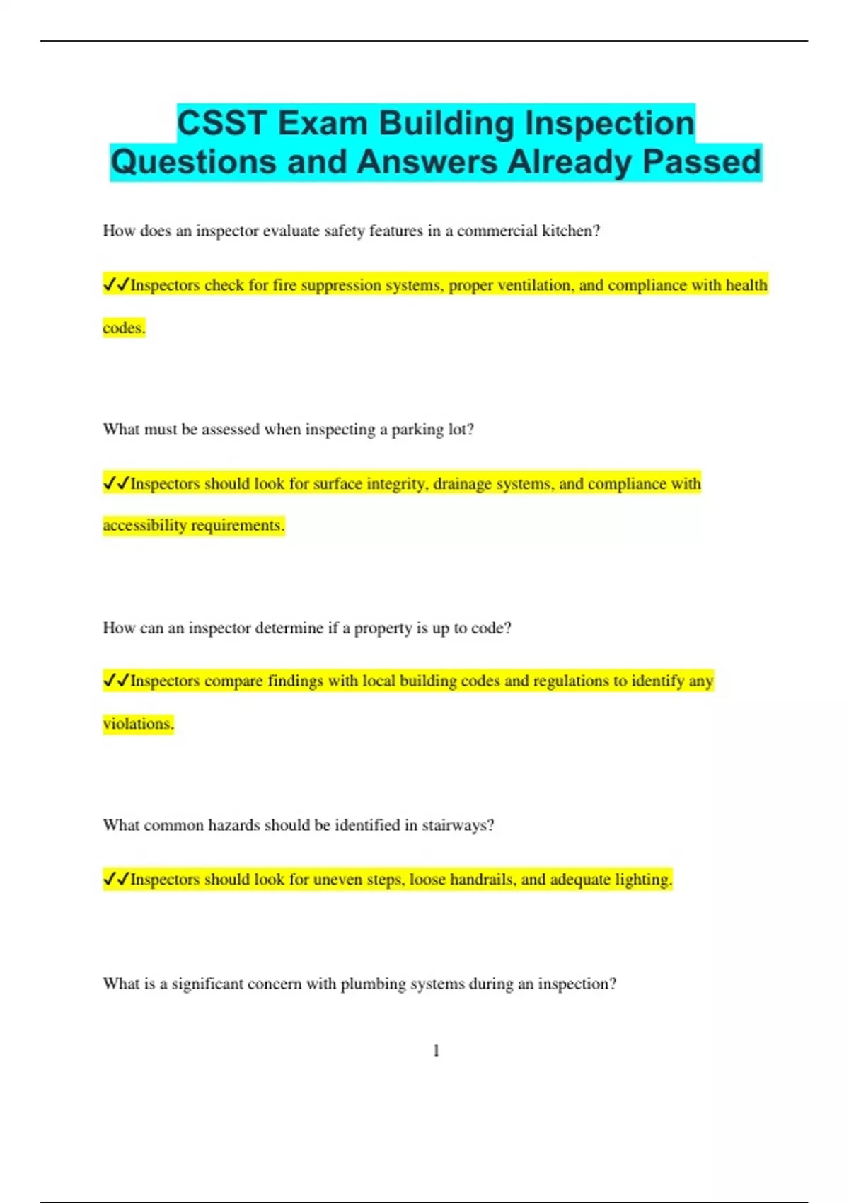 CSST Exam Building Inspection Questions and Answers Already Passed How does an inspector evaluate safety features in a commercial kitchen? Inspectors check for fire suppression systems, proper ventilation, and compliance with health codes. What must be assessed when inspecting a parking lot? Inspectors should look for surface integrity, drainage systems, and compliance with accessibility requirements. How can an inspector determine if a property is up to code? Inspectors compare findings with local building codes and regulations to identify any violations. What common hazards should be identified in stairways? Inspectors should look for uneven steps, loose handrails, and adequate lighting. What is a significant concern with plumbing systems during an inspection? 2 Inspectors need to identify leaks, water pressure issues, and compliance with safety standards. What key factor should be evaluated during an inspection of a commercial property? The inspector should assess the overall structural integrity and compliance with safety standards. How can moisture intrusion affect a building? Moisture intrusion can lead to mold growth, structural damage, and a decline in indoor air quality. What is a common indicator of roof wear? Curling or missing shingles often indicate that a roof may need repair or replacement. What essential feature should be inspected in a building's basement? The inspector should check for signs of flooding, cracks, and proper drainage systems. Why is it important to verify the age of a building’s electrical system? 3 Older electrical systems may not meet current safety codes and could pose fire hazards. What type of flooring issues should an inspector look for? Inspectors should check for warping, water damage, and uneven surfaces in flooring. What are the implications of inadequate attic ventilation? Inadequate ventilation can cause heat buildup, leading to damage to roofing materials and insulation. What should be examined in a building’s foundation?