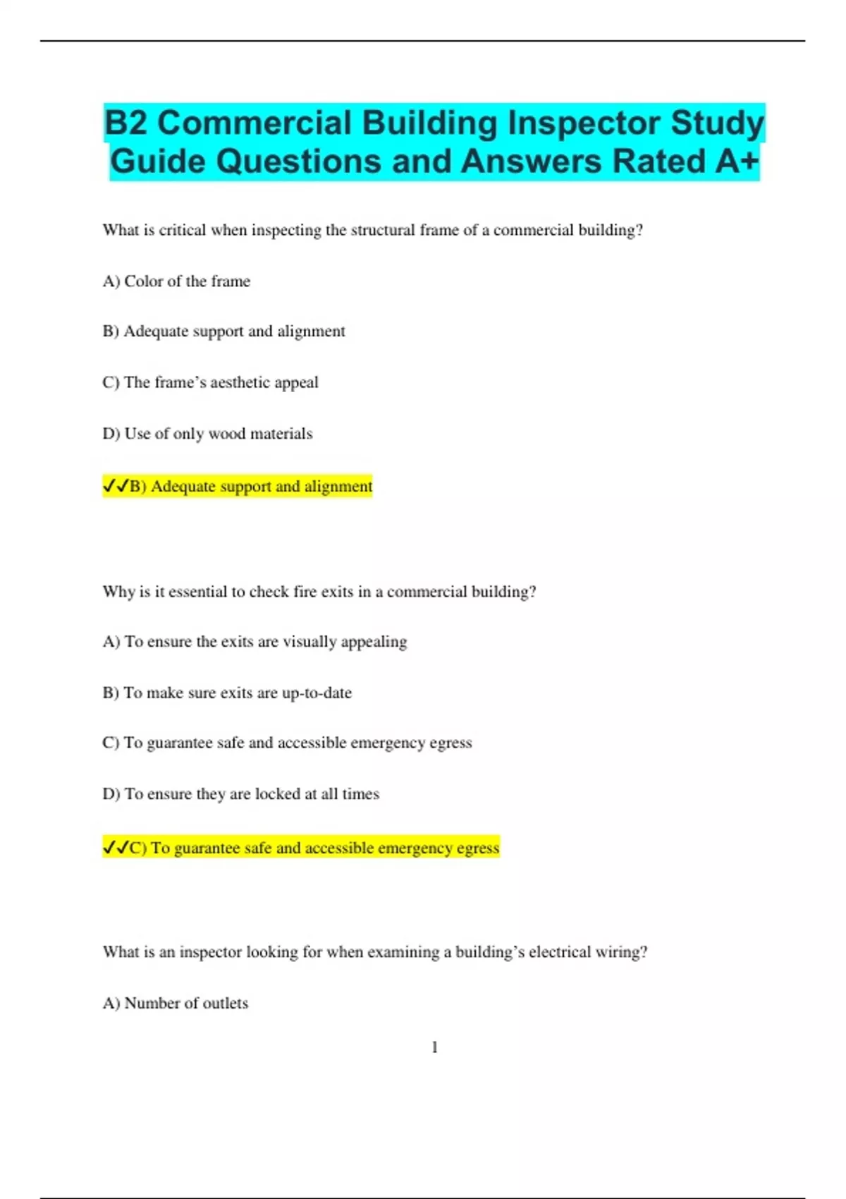 B2 Commercial Building Inspector Study Guide Questions and Answers Rated A+ What is critical when inspecting the structural frame of a commercial building? A) Color of the frame B) Adequate support and alignment C) The frame’s aesthetic appeal D) Use of only wood materials B) Adequate support and alignment Why is it essential to check fire exits in a commercial building? A) To ensure the exits are visually appealing B) To make sure exits are up-to-date C) To guarantee safe and accessible emergency egress D) To ensure they are locked at all times C) To guarantee safe and accessible emergency egress What is an inspector looking for when examining a building’s electrical wiring? A) Number of outlets 2 B) Proper grounding and absence of hazards C) Type of light fixtures D) Location of light switches B) Proper grounding and absence of hazards Which is a key indicator of water intrusion in commercial roofing? A) Sunlight exposure B) Stains or mold on ceilings C) Ventilation presence D) Presence of insulation B) Stains or mold on ceilings What is the purpose of checking fireproofing materials on structural elements? A) To confirm their color consistency B) To prevent spread of fire and maintain structural integrity C) To verify they are visible D) To improve air circulation B) To prevent spread of fire and maintain structural integrity 3 What should be verified when inspecting accessible parking spaces? A) They are painted in bright colors B) They are close to the entrance with adequate signage C) They are separate from other parking spots D) They have a security guard B) They are close to the entrance with adequate signage Why is inspecting plumbing systems crucial in a commercial building? A) To test water flavor B) To ensure there are no leaks or pressure issues C) To improve decor in bathrooms