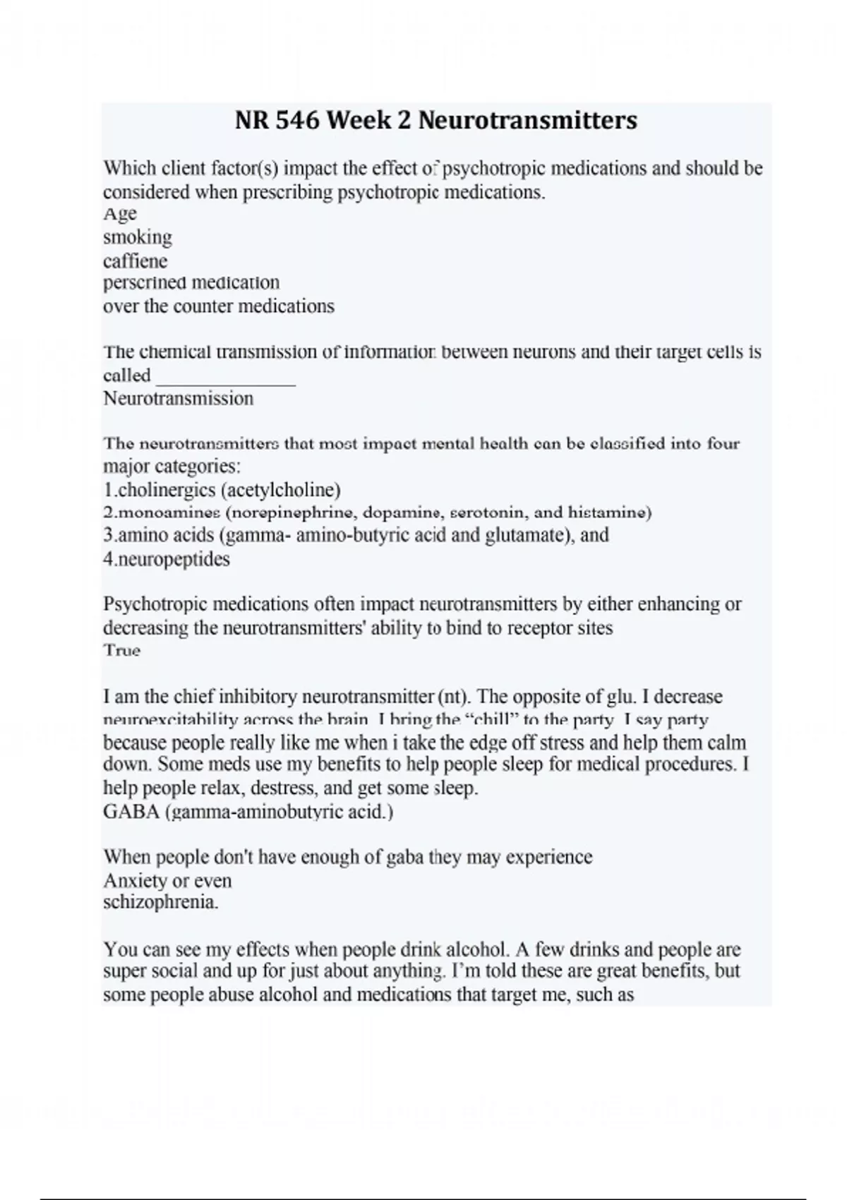 NR 546 Week 2 Neurotransmitters