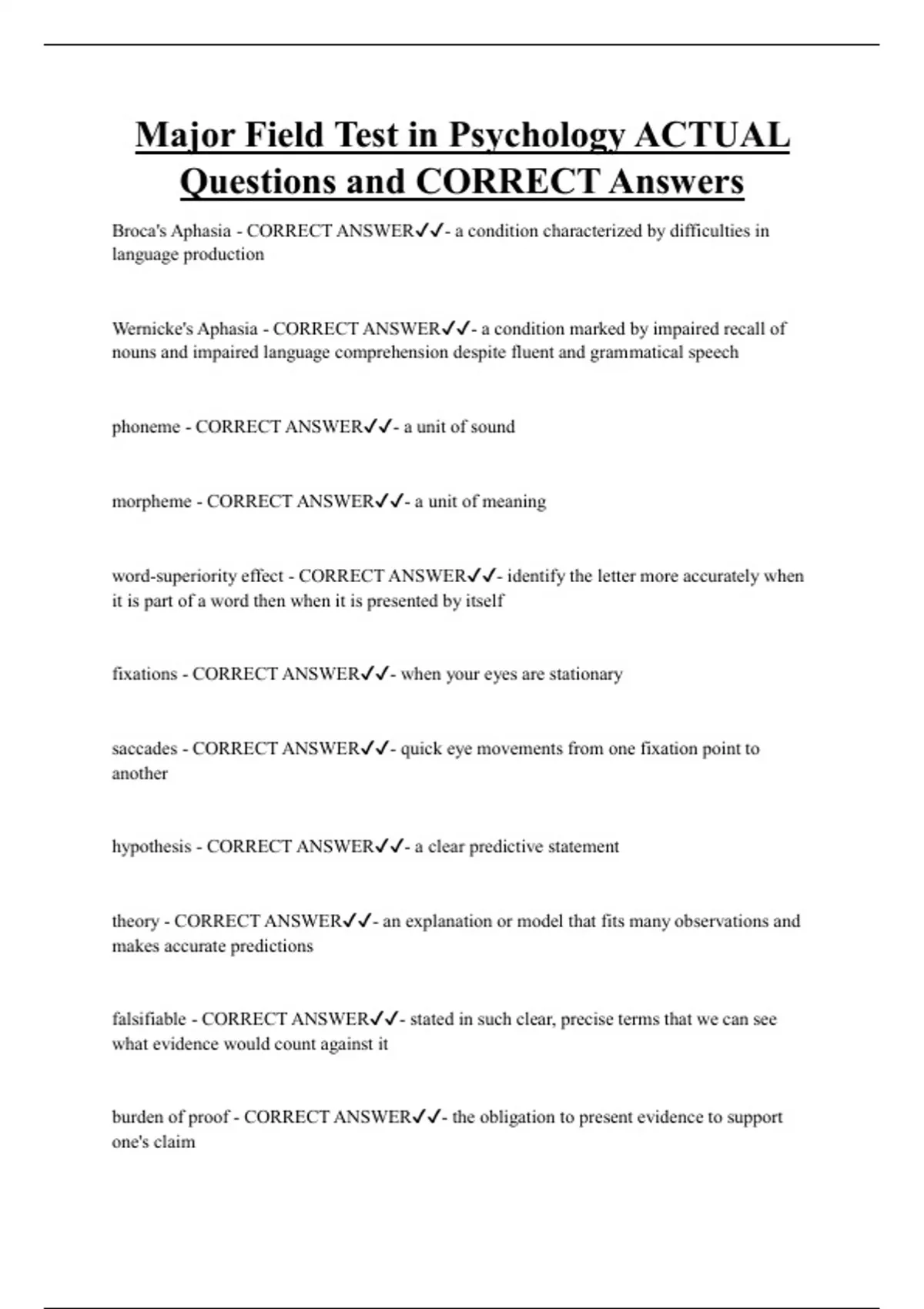 Major Field Test in Psychology ACTUAL Questions and CORRECT Answers Broca's Aphasia - CORRECT ANSWER- a condition characterized by difficulties in language production Wernicke's Aphasia - CORRECT ANSWER- a condition marked by impaired recall of nouns and impaired language comprehension despite fluent and grammatical speech phoneme - CORRECT ANSWER- a unit of sound morpheme - CORRECT ANSWER- a unit of meaning