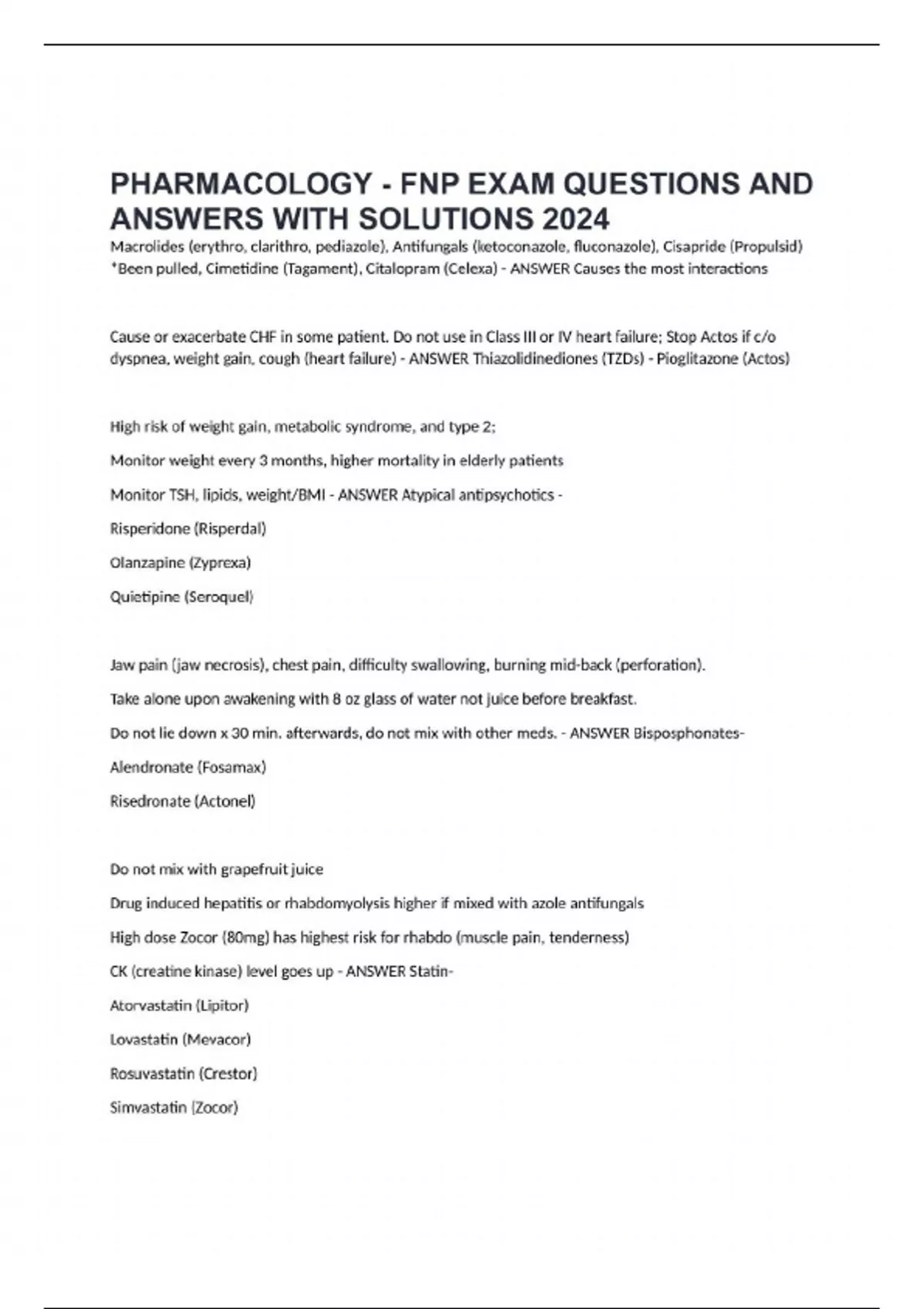 PHARMACOLOGY - FNP EXAM QUESTIONS AND ANSWERS WITH SOLUTIONS 2024 Macrolides (erythro, clarithro, pediazole), Antifungals (ketoconazole, fluconazole), Cisapride (Propulsid) *Been pulled, Cimetidine (Tagament), Citalopram (Celexa) - ANSWER Causes the most interactions Cause or exacerbate CHF in some patient. Do not use in Class III or IV heart failure; Stop Actos if c/o dyspnea, weight gain, cough (heart failure) - ANSWER Thiazolidinediones (TZDs) - Pioglitazone (Actos) High risk of weight gain, metabolic syndrome, and type 2; Monitor weight every 3 months, higher mortality in elderly patients Monitor TSH, lipids, weight/BMI - ANSWER Atypical antipsychotics - Risperidone (Risperdal) Olanzapine (Zyprexa) Quietipine (Seroquel) Jaw pain (jaw necrosis), chest pain, difficulty swallowing, burning mid-back (perforation). Take alone upon awakening with 8 oz glass of water not juice before breakfast. Do not lie down x 30 min. afterwards, do not mix with other meds. - ANSWER Bisposphonates- Alendronate (Fosamax) Risedronate (Actonel) Do not mix with grapefruit juice Drug induced hepatitis or rhabdomyolysis higher if mixed with azole antifungals High dose Zocor (80mg) has highest risk for rhabdo (muscle pain, tenderness) CK (creatine kinase) level goes up - ANSWER Statin- Atorvastatin (Lipitor) Lovastatin (Mevacor) Rosuvastatin (Crestor) Simvastatin (Zocor)