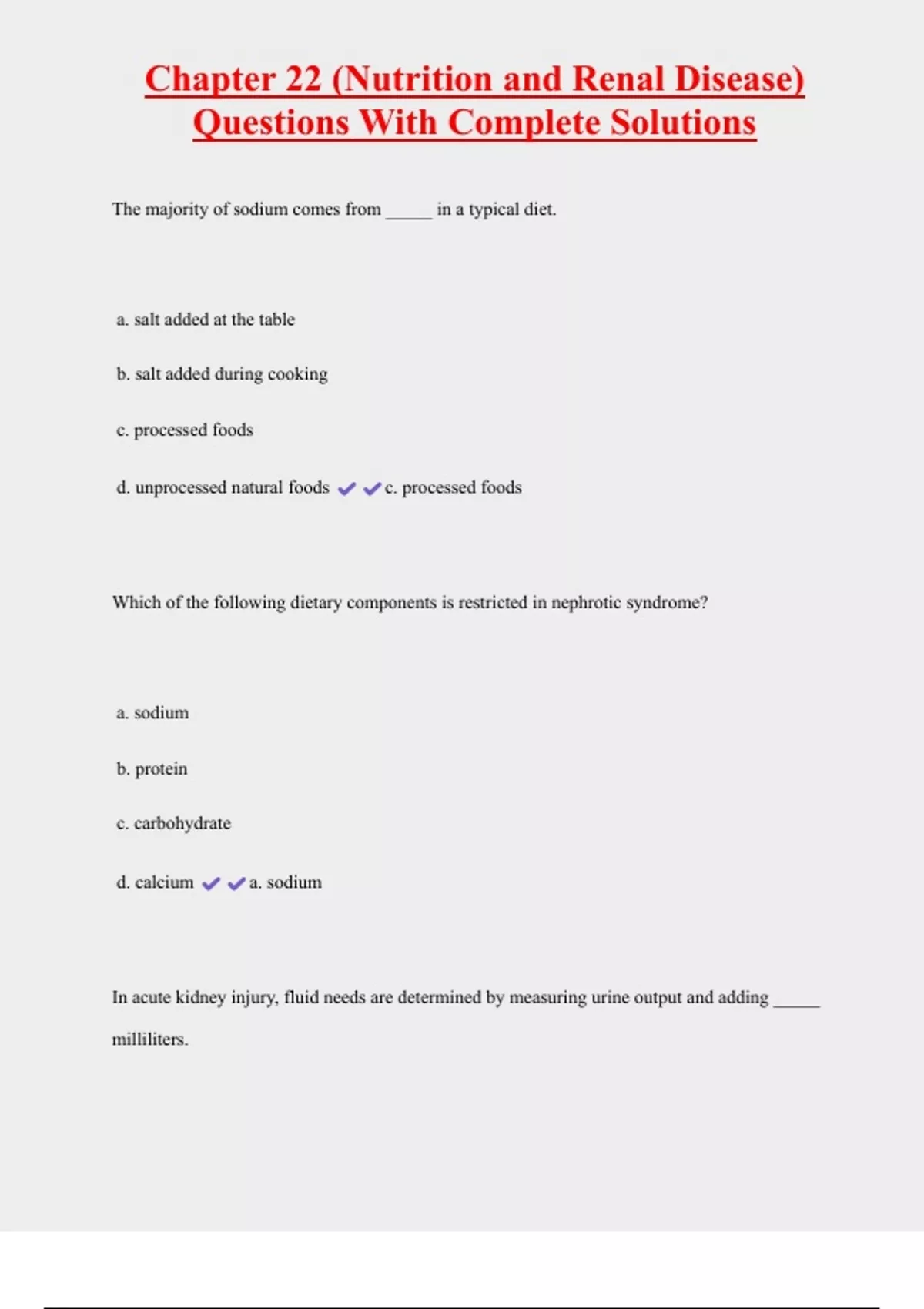 Chapter 22 (Nutrition and Renal Disease) Questions With Complete Solutions The majority of sodium comes from _____ in a typical diet. a. salt added at the table b. salt added during cooking c. processed foods d. unprocessed natural foods c. processed foods Which of the following dietary components is restricted in nephrotic syndrome? a. sodium b. protein c. carbohydrate d. calcium a. sodium