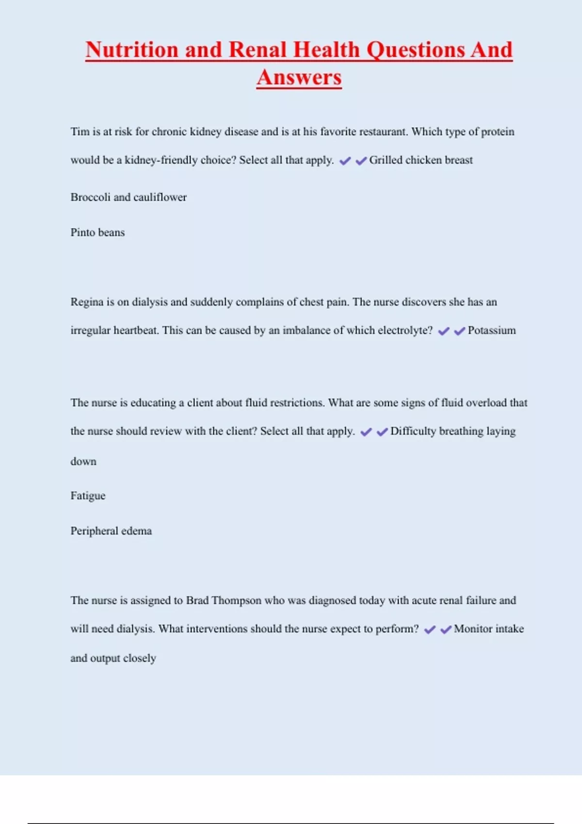 , Nutrition and Renal Health Questions And
