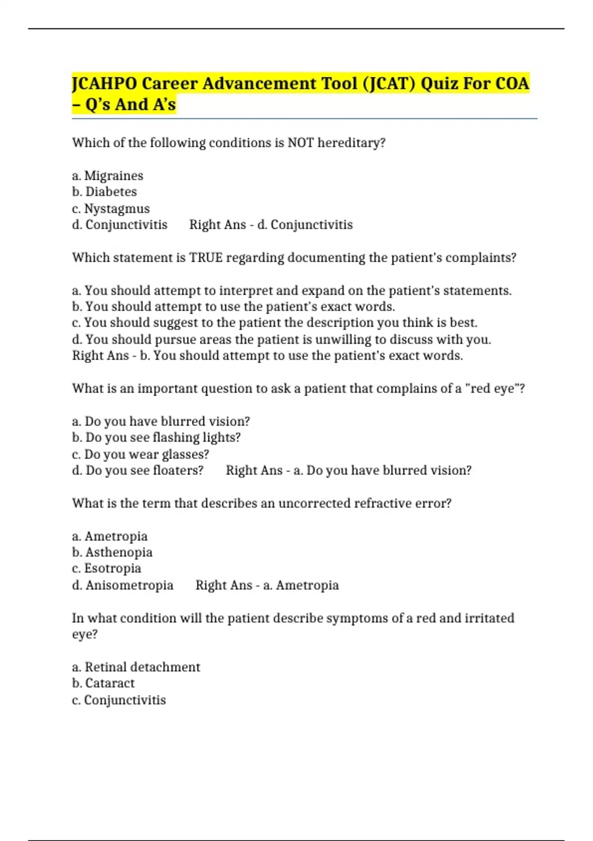 ,d. Open-angle glaucoma Right Ans - c. Conjunctivitis